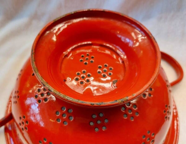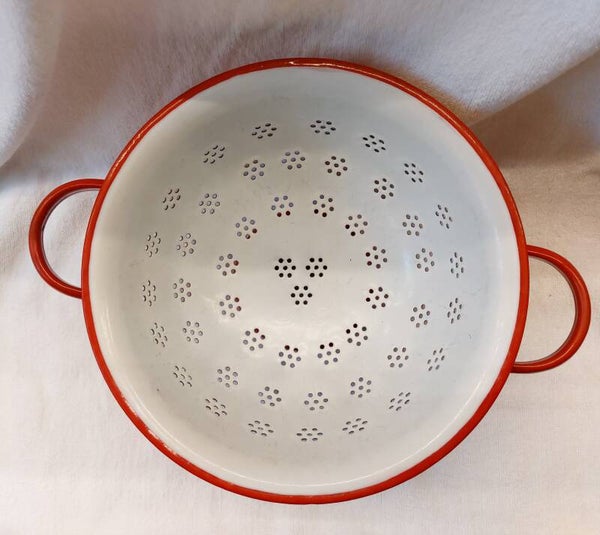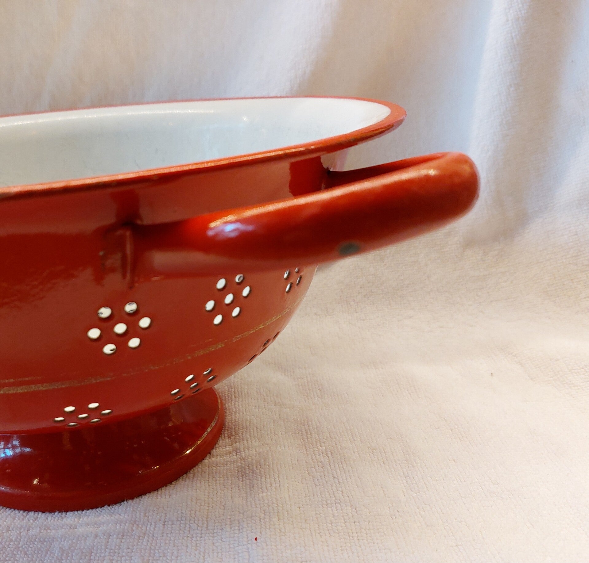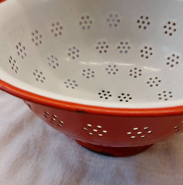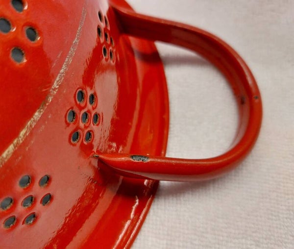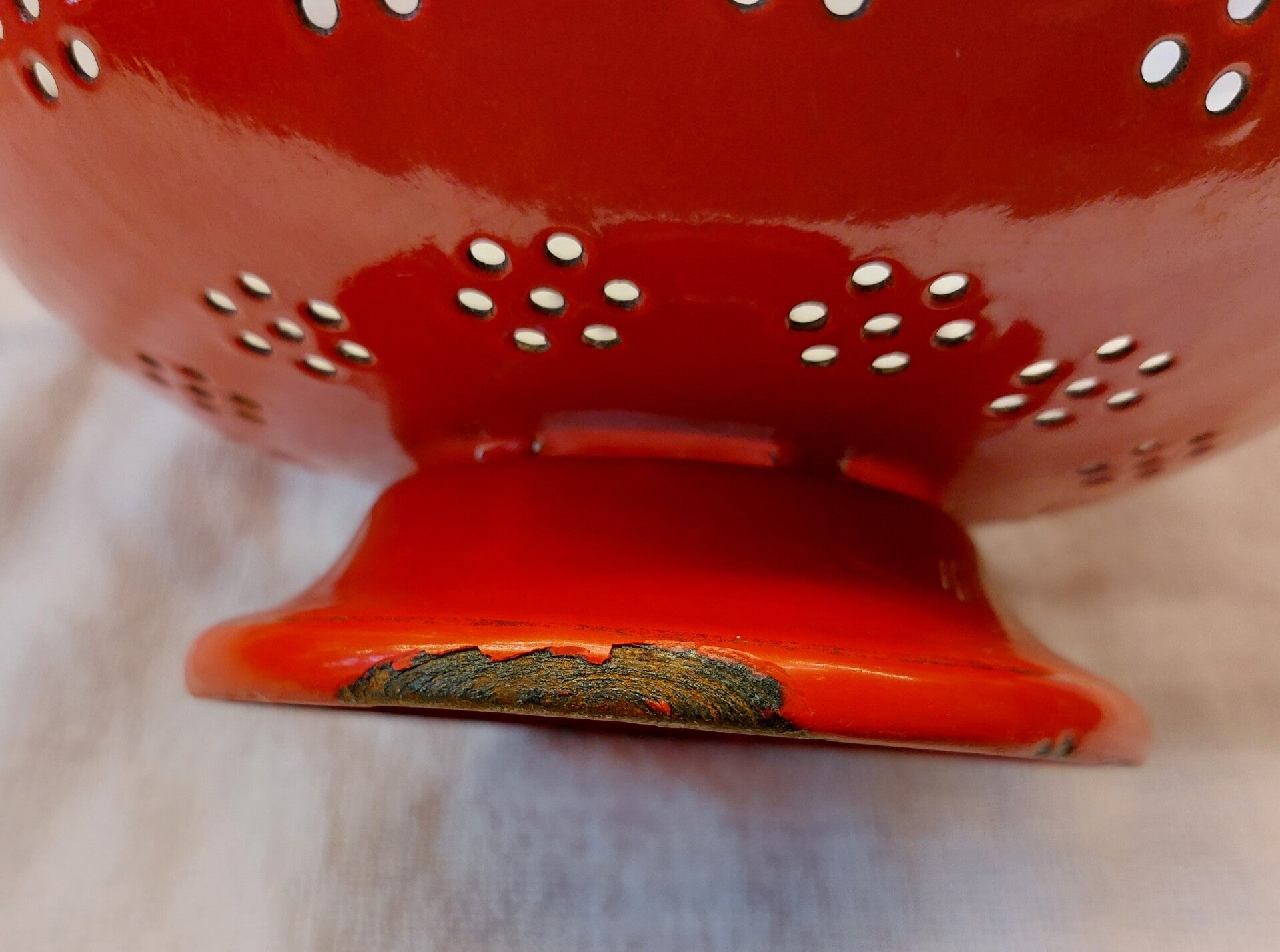 Dit emaille vergiet heeft een hele kleine beschadiging op de rand. Het ene oor heeft een kleine beschadiging op de zijkant en aan de onderkant. Het andere oor heeft één beschadiging aan de zijkant. Aan de zijkant van de voet zit een grote beschadiging. Rondom de voet zitten een aantal lichte beschadigingen en wat roest rondom de voet. Dit heeft geen invloed op de stabiliteit van het vergiet. Aan de binnenkant van de voet zit een beschadiging. Dit heeft geen invloed op de stabiliteit van de voet.