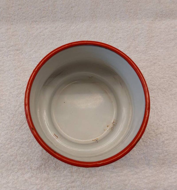 Dit oude zand bakje heeft wat lichte plekjes aan de binnenkant. Op de rand aan de bovenkant, zit één kleine beschadiging. Op de onderkant van het bakje zitten twee beschadigingen.