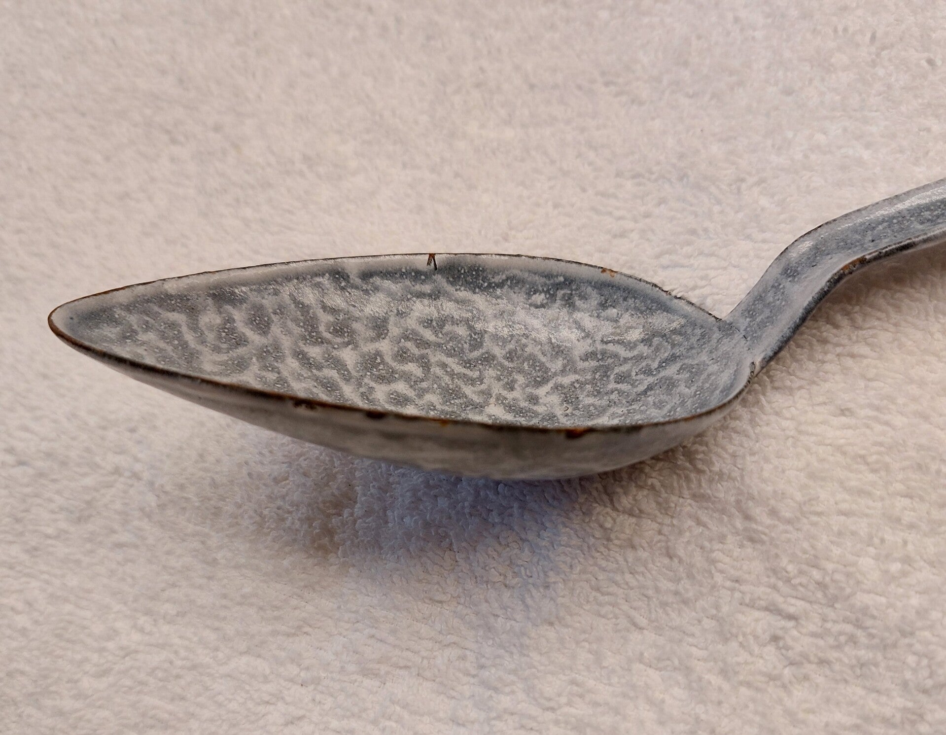 De schuimspaan heeft een hele kleine beschadiging op de voorkant. De lepel heeft kleine roest plekjes op de voorkant. Op de achterkant van de lepel zitten twee beschadigingen. De sauslepel heeft op de rand een paar hele kleine plekjes.