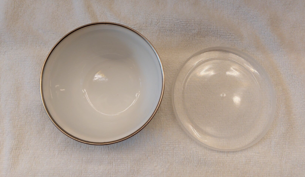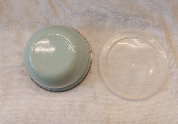 Dit emaille schaaltje heeft een handige, goed afsluitend deksel. Perfect om eten in te bewaren.