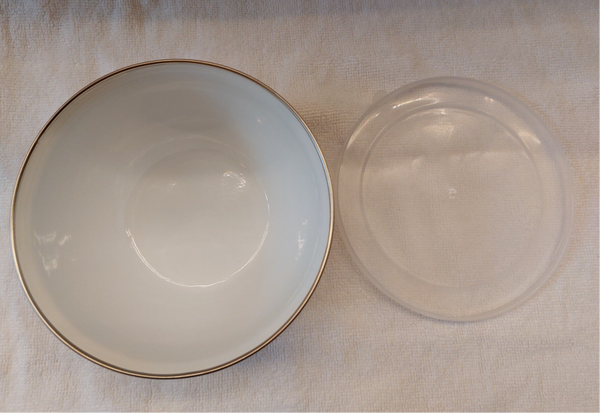Dit emaille schaaltje heeft een handige, goed afsluitend deksel. Perfect om eten in te bewaren.