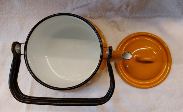 Emaille ketel mosterd geel met witte stippen