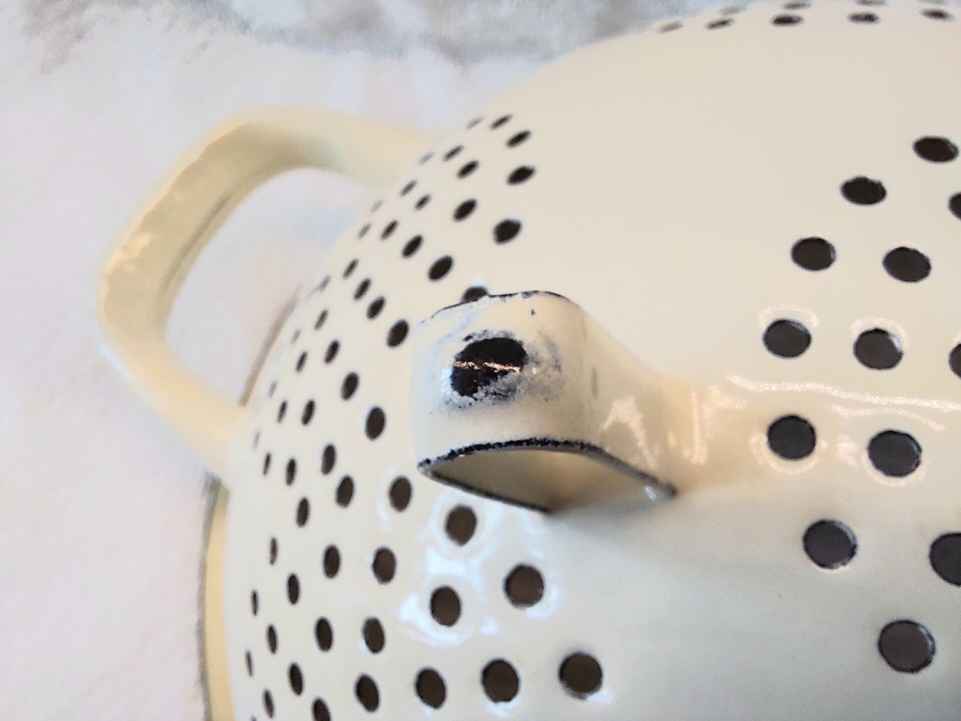 Let op: Dit emaille vergiet heeft wat zwarte stukken/vlekken in de groene verf en onderop de pootjes. Dit zit in het emaille gebakken. Dit zijn geen beschadigingen. Emaille is handwerk en kan soms wat oneffenheden bevatten. Helaas hebben wij hier geen invloed op.