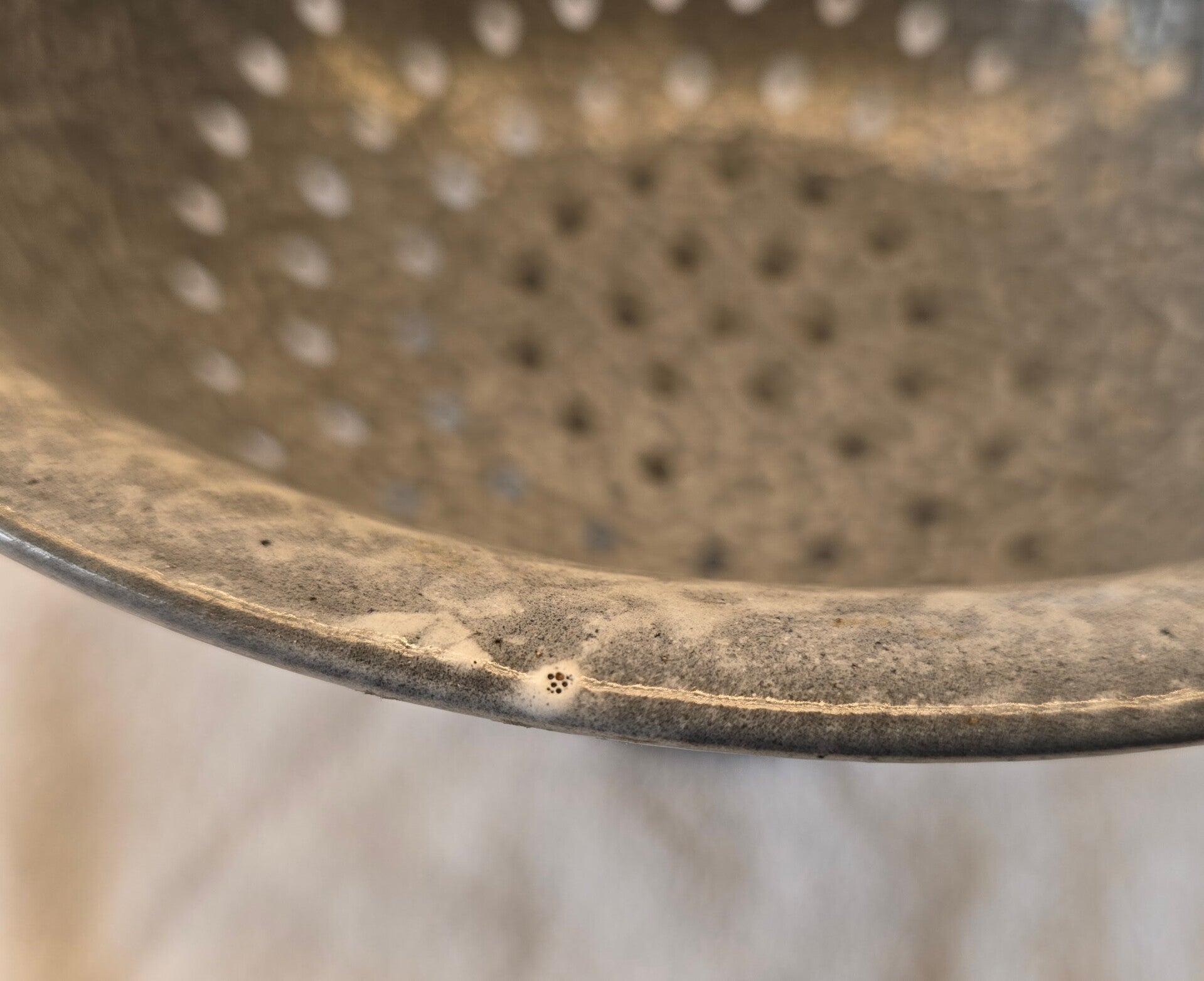 Dit oude emaille vergiet heeft één klein plekje op de rand. Op de oren zit een klein roest plekje en op één van de oren een hele kleine beschadiging. Rondom de voet zit wat lichte roest plekjes. Dit heeft geen invloed op de stabiliteit van het vergiet.