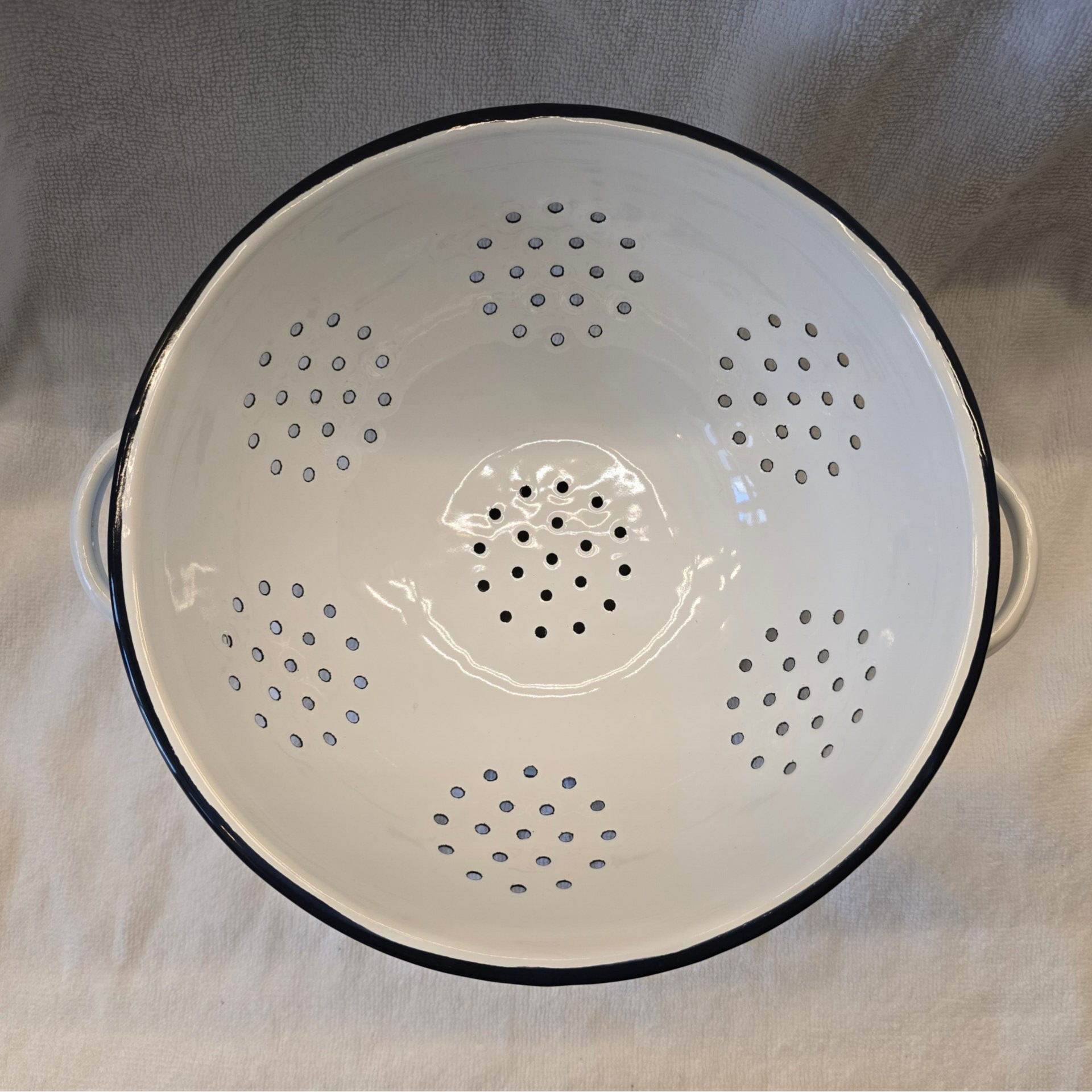 Nieuw emaille vergiet wit met blauwe rand op voet