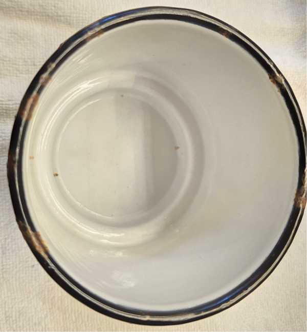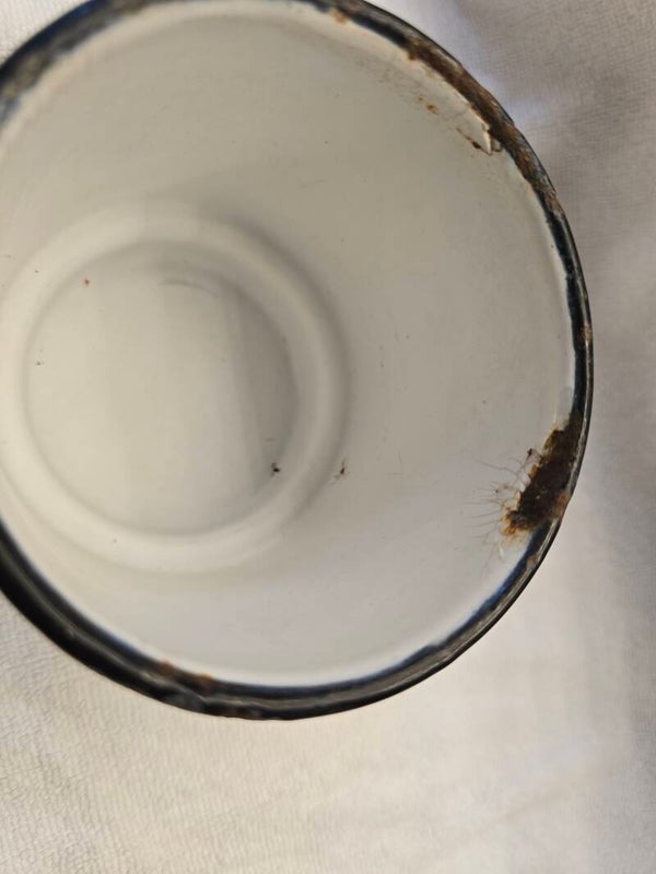 Deze zand, zeep en soda is compleet. Dit item zie je niet zo vaak in deze kleurstelling. Waarschijnlijk werd dit alleen speciaal op bestelling gemaakt. Dit wit emaille heeft een marmer achtige kleurstelling, in de combinatie met zwart en roze. Het roze kan je helaas niet zo goed zien op de foto.
