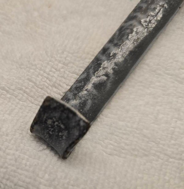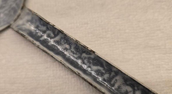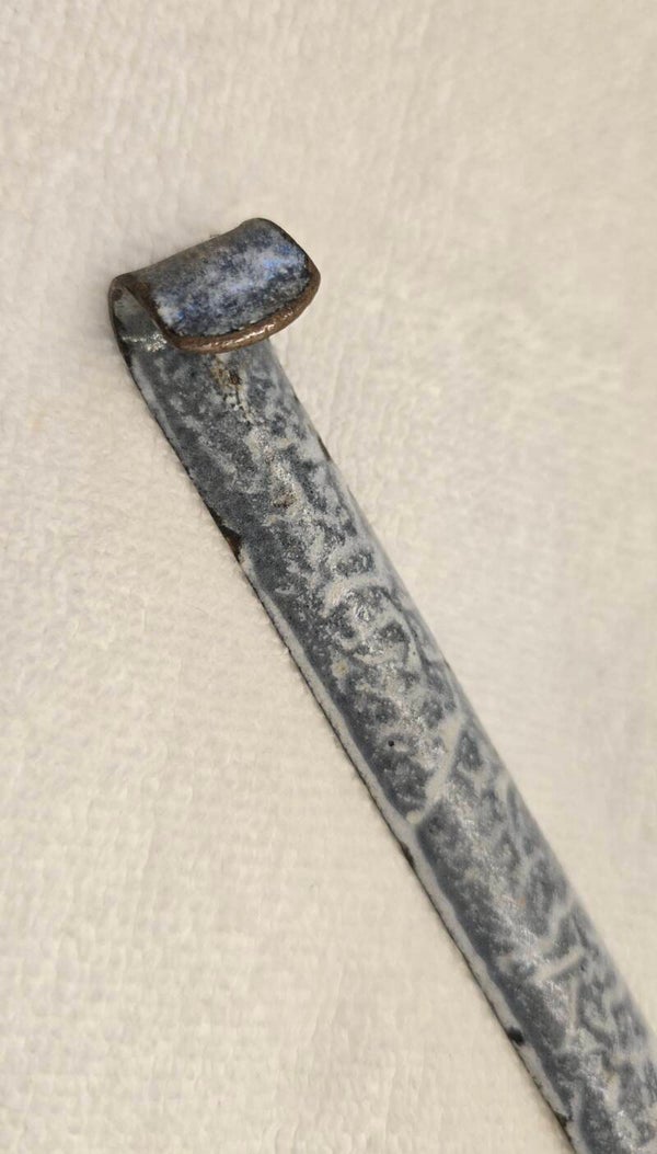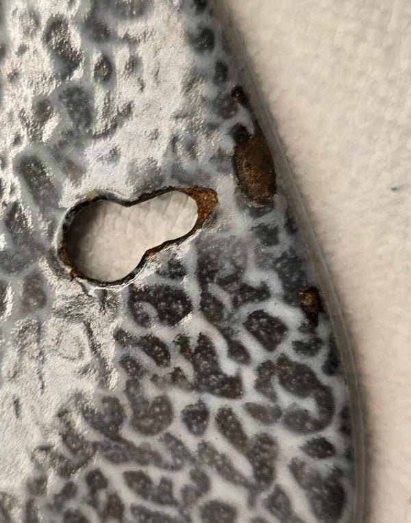 Dit emaille lepelrek heeft aan de onderkant, van het rekje twee plekjes. Dit zijn geen beschadigingen. De verf was toen der tijd wat bijzonder verdeeld. Het emaille is goed afgedekt. Emaille is handwerk en kan soms wat oneffenheden bevattten. Hier hebben wij helaas geen invloed op. Bij de gaatjes zitten op de voorkant en aan de achterkant wat beschadigingen. Dit heeft geen invloed op de stevigheid van het rekje. Rondom de rand van het rekje zitten wat roest plekken.