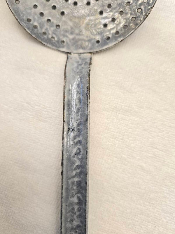 De schuimspaan heeft rondom de rand van lichte beschadigingen. De steel van de schuimspaan heeft hier en daar wat beschadigingen. Op het hanggedeelte zitten een aantal kleine beschadigingen. De emaille lepel heeft rondom de rand een aantal lichte beschadigingen. Op de achterkant van de lepel zit een lichte beschadiging. Aan de binnenkant van de lepel zit een kleine beschadiging. Op de steel van de lepel zitten een aantal beschadigingen. Op het hanggedeelte zitten een aantal kleine beschadigingen. Op de sauslepel zitten rondom de rand een aantal lichte beschadigingen. Op de onderkant van de lepel zit een beschadiging. Aan de achterkant van de lepel zitten een paar beschadigingen. Op de steel van de sauslepel zitten een aantal beschadigingen. Op het hanggedeelte zitten een aantal beschadigingen.
