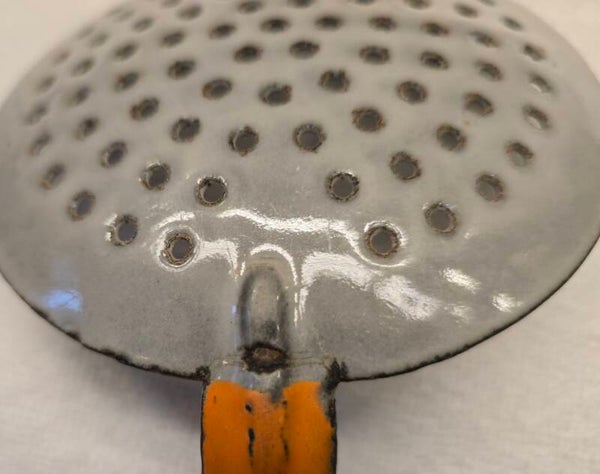 Het oude lepelrek heeft wat roest bij de gaatjes. Dit heeft geen invloed op de stevigheid van het rekje. Op de randen van het rekje zitten een aantal beschadigingen. Op de schuimspaan zit rondom de rand een aantal beschadigingen. Op de achterkant van de schuimspaan zitten een paar kleine beschadigingen. Op de steel van de schuimspaan zitten een aantal beschadigingen. Op het hangedeelte van de schuimspaan zitten een aantal kleine beschadigingen.