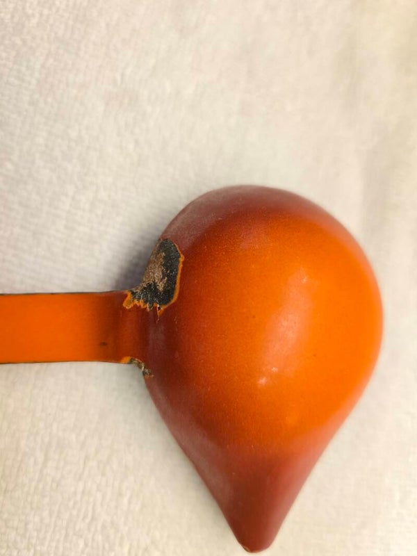 Op de emaille lepel zitten aan de binnenkant van de lepel een aantal beschadigingen. Op de achterkant van de lepel zitten een aantal flinke beschadigingen. Op de onderkant van de lepel zit wat waas. Op de steel van de emaille lepel zitten een aantal kleine beschadigingen. Op het hanggedeelte van de lepel zitten een aantal kleine beschadigingen. Op de sauslepel zit aan de binnenkant een kleine beschadiging. Op de achterkant van de sauslepel zitten een aantal beschadigingen. Op de steel zitten een aantal kleine beschadigingen. Op het hanggedeelte zitten een aantal kleine beschadigingen.