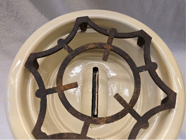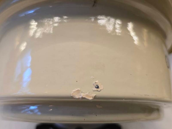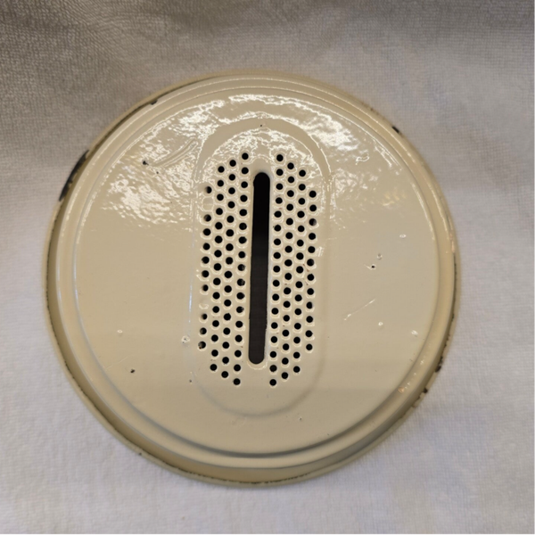 Dit petroleumstel heeft roest op het rekje. Dit heeft geen invloed op de stabiliteit van het rekje. Aan de binnenkant van het bovenste deel zitten een aantal beschadigingen. Rondom de rand zitten een aantal beschadigingen. Aan de zijkant van het bovenste deel zit wat kleine plekjes. Aan de onderkant van het bovenste deel zit een kleine beschadiging. Op de pit zitten een aantal kleine beschadigingen. Onder de pit zitten wat roest plekjes. Dit heeft geen invloed op het functioneren van de pit. Op de rand van het onderste deel zit een kleine beschadiging. Aan de binnenkant van het onderste deel zitten kleine plekjes. Dit heeft geen invloed op de bodem. Op de zijkant van het onderste deel zitten krasjes en roest plekjes in het emaille. Dit heeft geen invloed op de bodem. Op de pootjes zitten op de bovenkant en aan de onderkant wat roest. Dit heeft geen invleod op de stabiliteit van het petroleumstel.