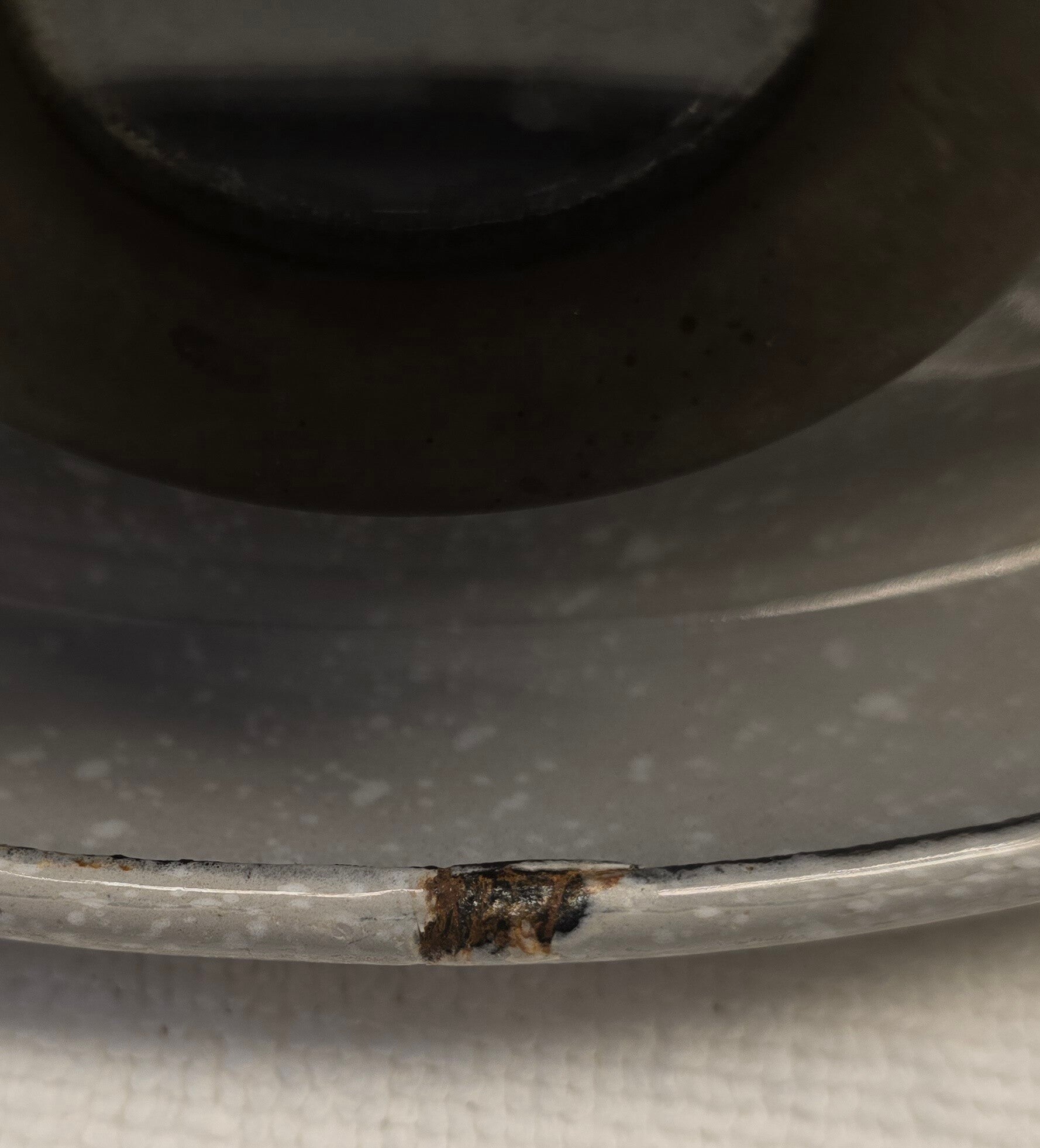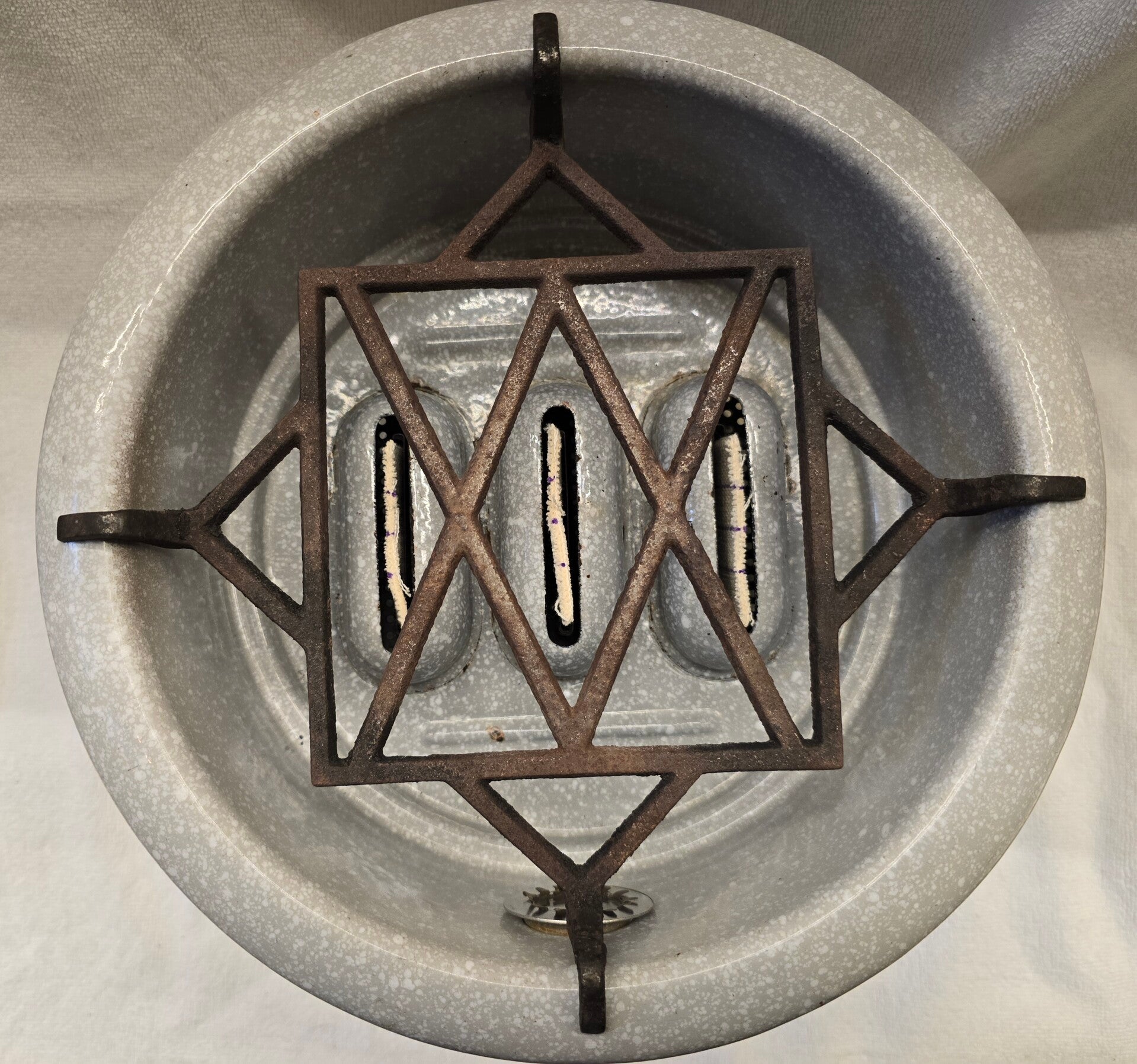 Dit petroleumstel heeft wat roest op het rekje. Dit heeft geen invloed op de stabiliteit van het rekje. Aan de binnenkant van het bovenste deel zitten een paar kleine plekjes. Rondom de rand aan de onderkant, zitten een aantal kleine beschadigingen. Aan de onderkant van het bovenste deel zitten een paar kleine beschadigingen. Op de pit zit een kleine beschadiging. Dit heeft geen invloed op het functioneren van de pitten. Op de onderkant van de pitten zitten wat roest plekjes. Dit heeft geen invloed op het functioneren van de pitten. Aan de zijkanten van het onderste deel zitten een paar kleine beschadigingen. Dit heeft geen invloed op het reservoir. Dit kan niet gaan lekken. Rondom de rand van het onderste deel zitten hier en daar wat beschadigingen. Op de pootjes zitten op de bovenkant, aan de zijkanten en aan de onderkant wat roest en kleine beschadigingen. Dit heeft geen invloed op de stabiliteit van het petroleumstel.