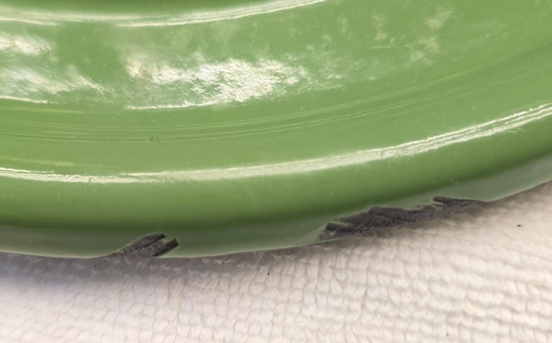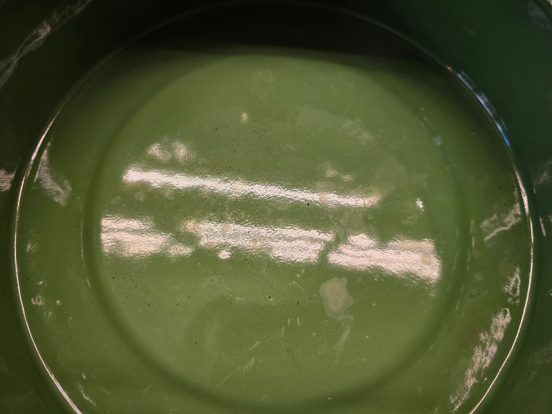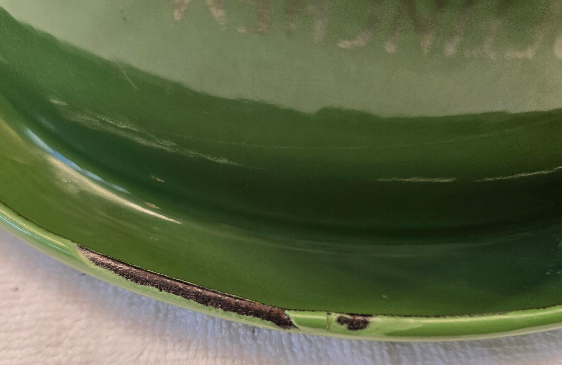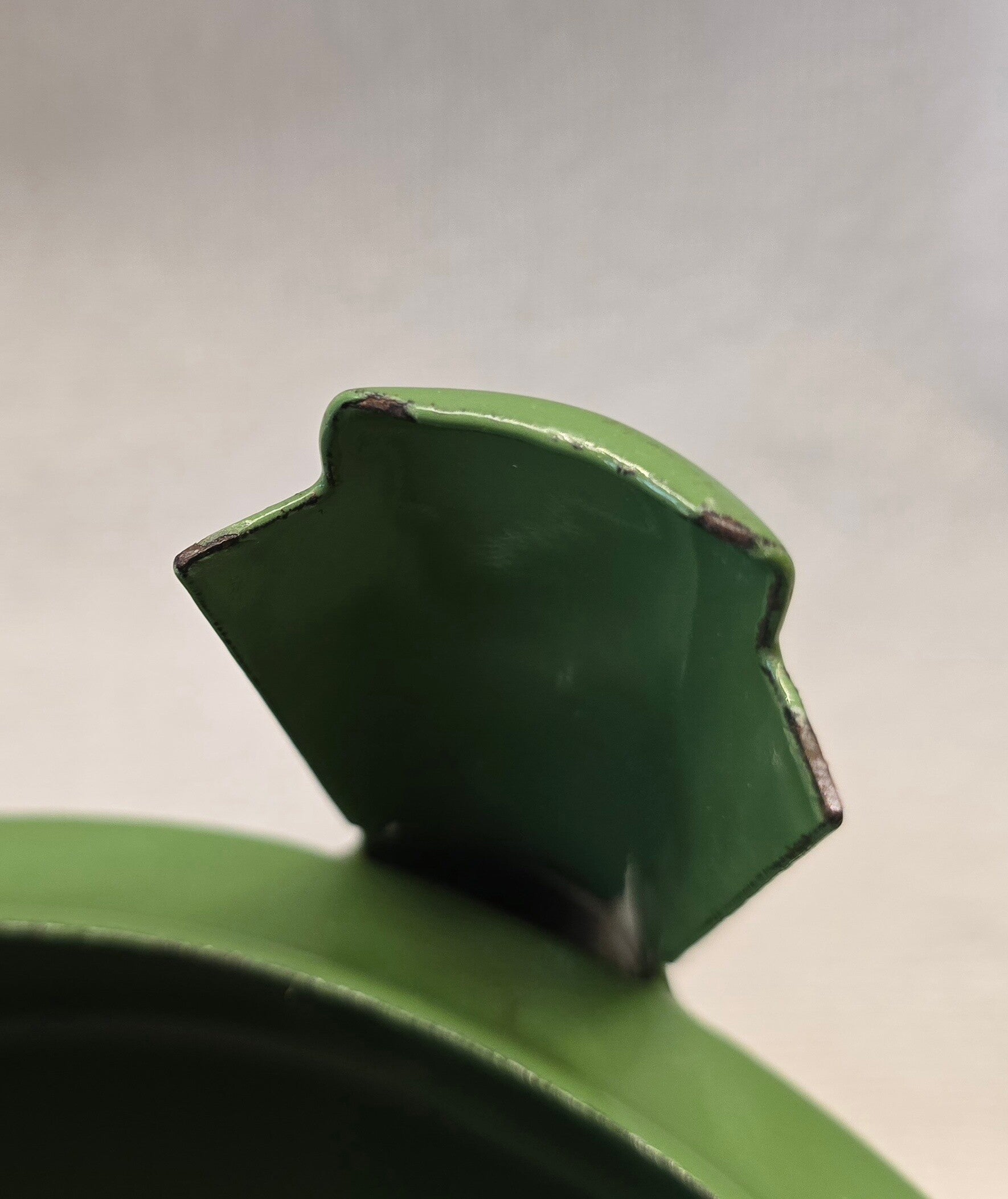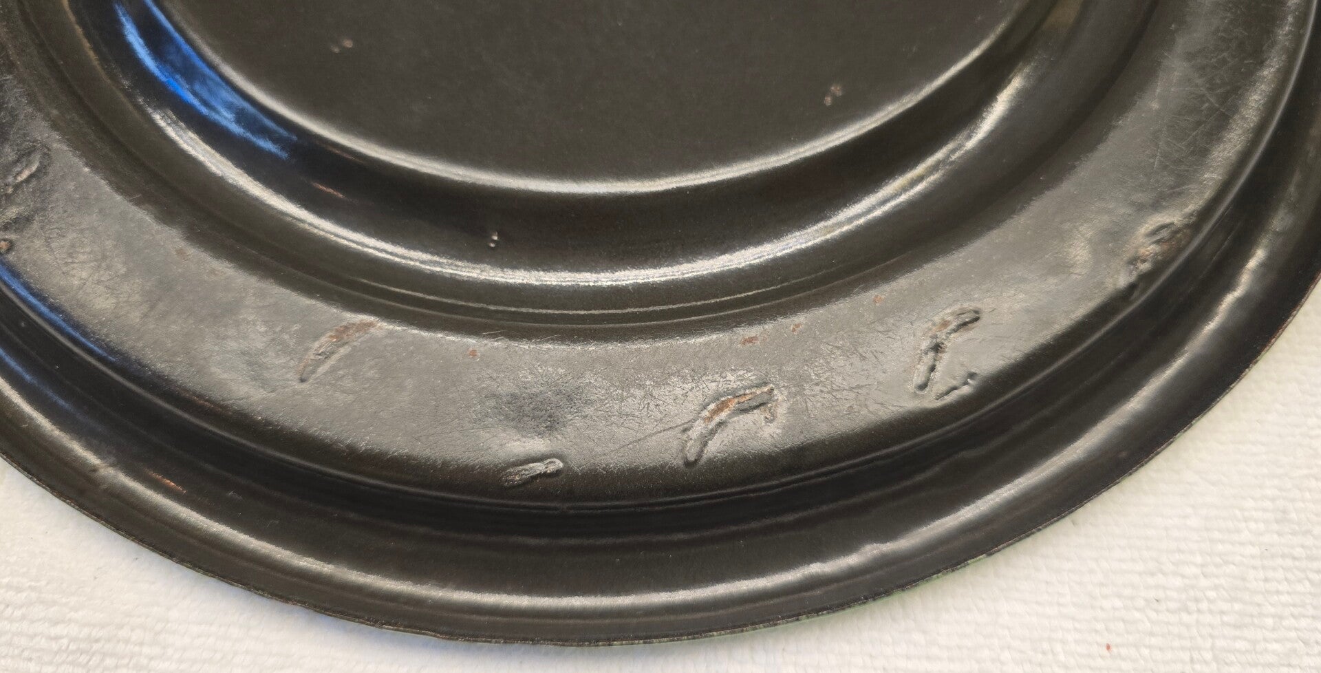 Het onderbord heeft een kleine bobbel in het emaille. Dit is geen beschadiging en heeft geen invloed op de stabiliteit van het onderbord. Emaille is handwerk en kan wat oneffenheden bevatten. Hier hebben wij helaas geen invloed op. Rondom de rand van het onderbord zit op de bovenkant en aan de onderkant hier en daar wat beschadigingen. Op de onderkant zitten een paar roest plekjes. Dit heeft geen invloed op de stabiliteit van het onderbord.