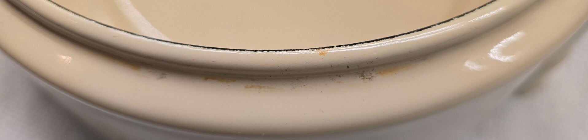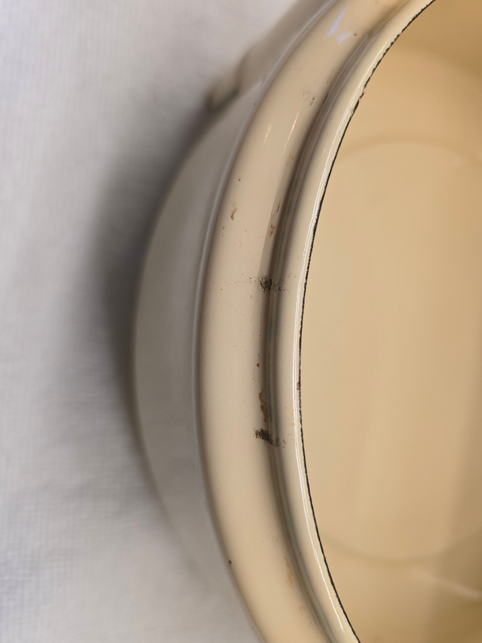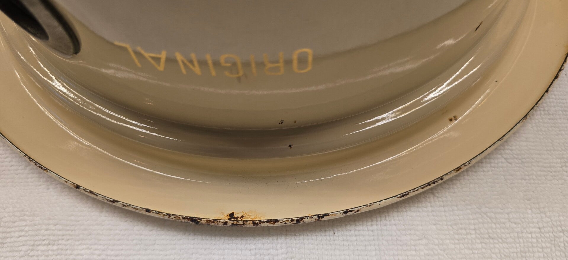 Rondom de rand van het onderste deel zitten een paar kleine beschadigingen. Op de pootjes zitten op de bovenkant, aan de zijkanten en aan de onderkant wat kleine beschadigingen en roest plekjes. Dit heeft geen invloed op de stabiliteit van het petroleumstel.