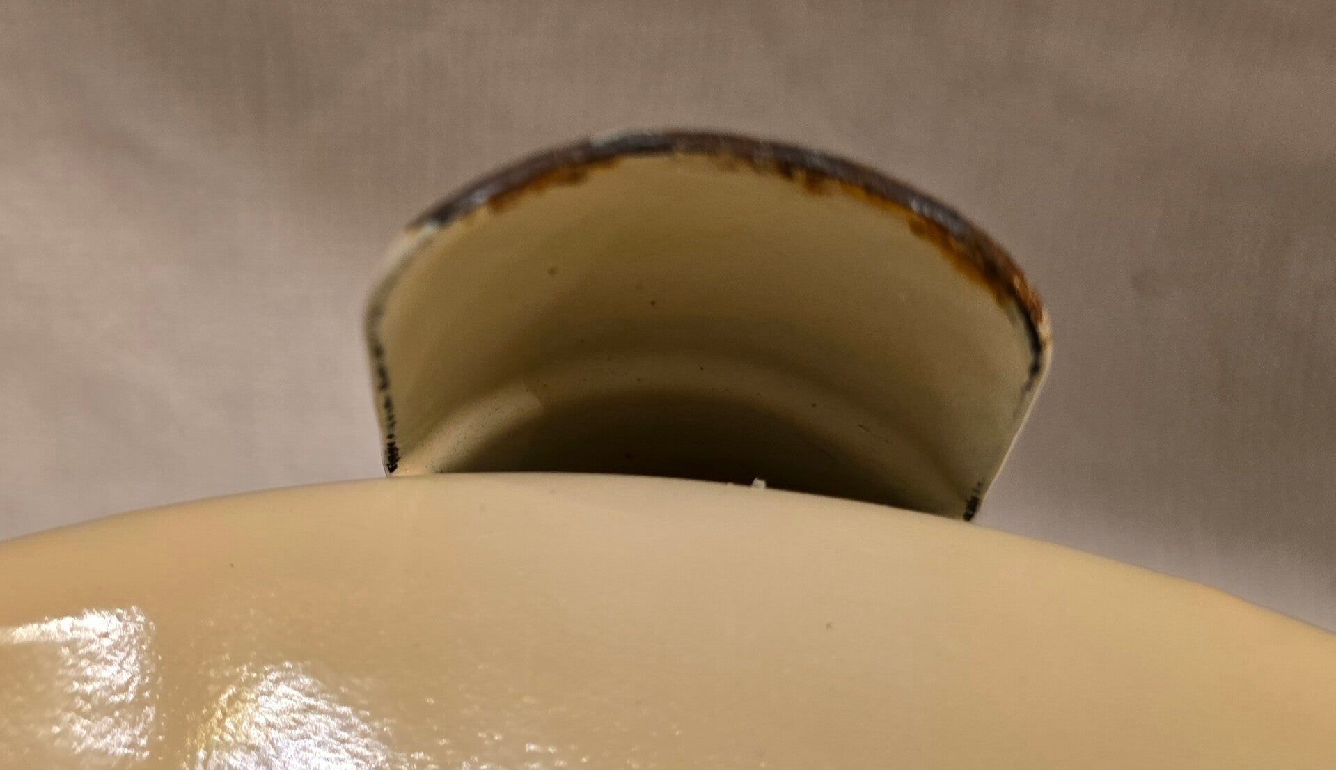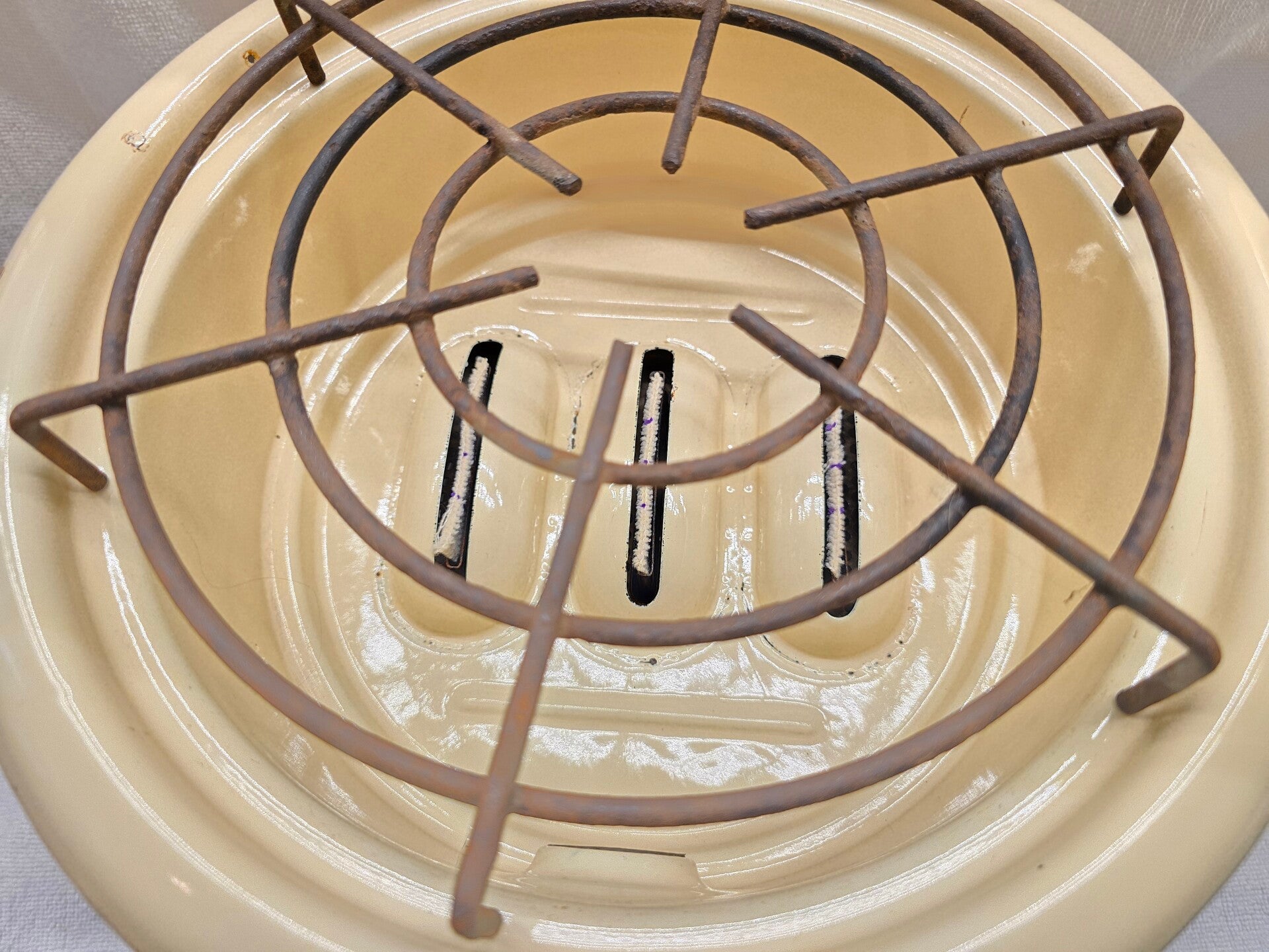 Dit petroleumstel heeft wat roest op het rekje. Dit heeft geen invloed op de stabiltet van het rekje. Aan de binnenkant van het bovenste deel zitten een paar kleine beschadigingen. Bovenop en aan de onderkant (rondom) de rand van het bovenste deel, zitten kleine beschadigingen. Op de onderkant van het bovenste deel zitten een paar kleine beschadigingen. Op de pitten zitten op de bovenkant hier en daar kleine roest plekjes. Op de onderkant van de pitten zitten wat roest plekjes. Dit heeft geen invloed op het functioneren van de pitten.