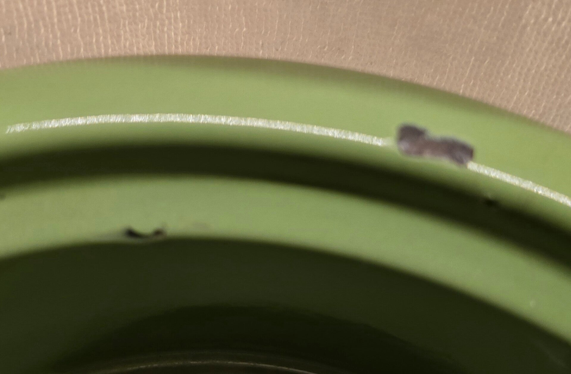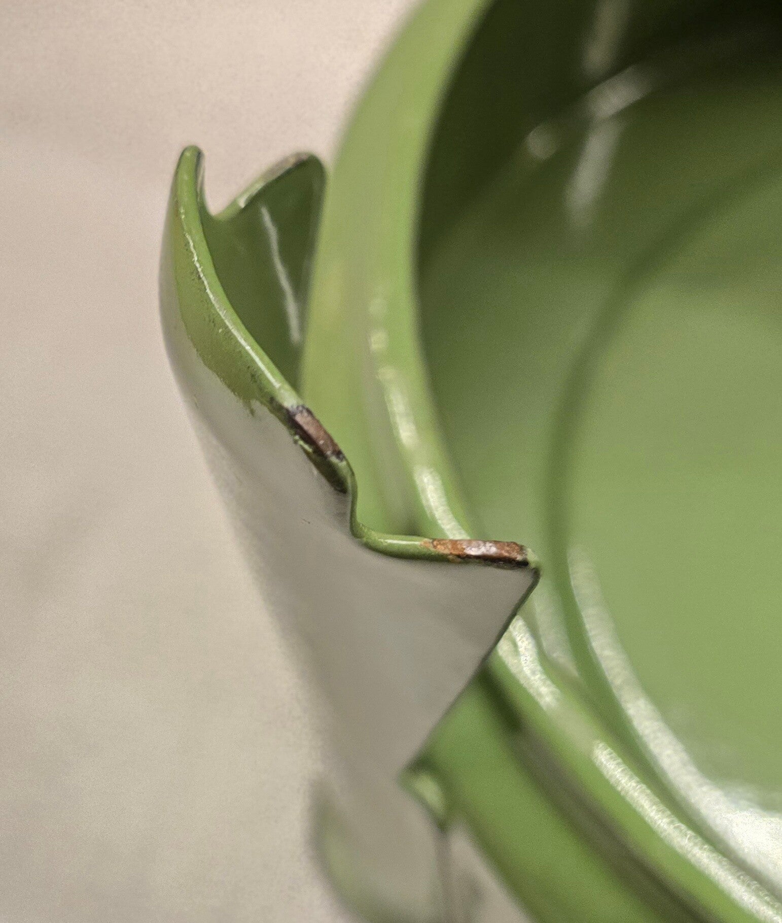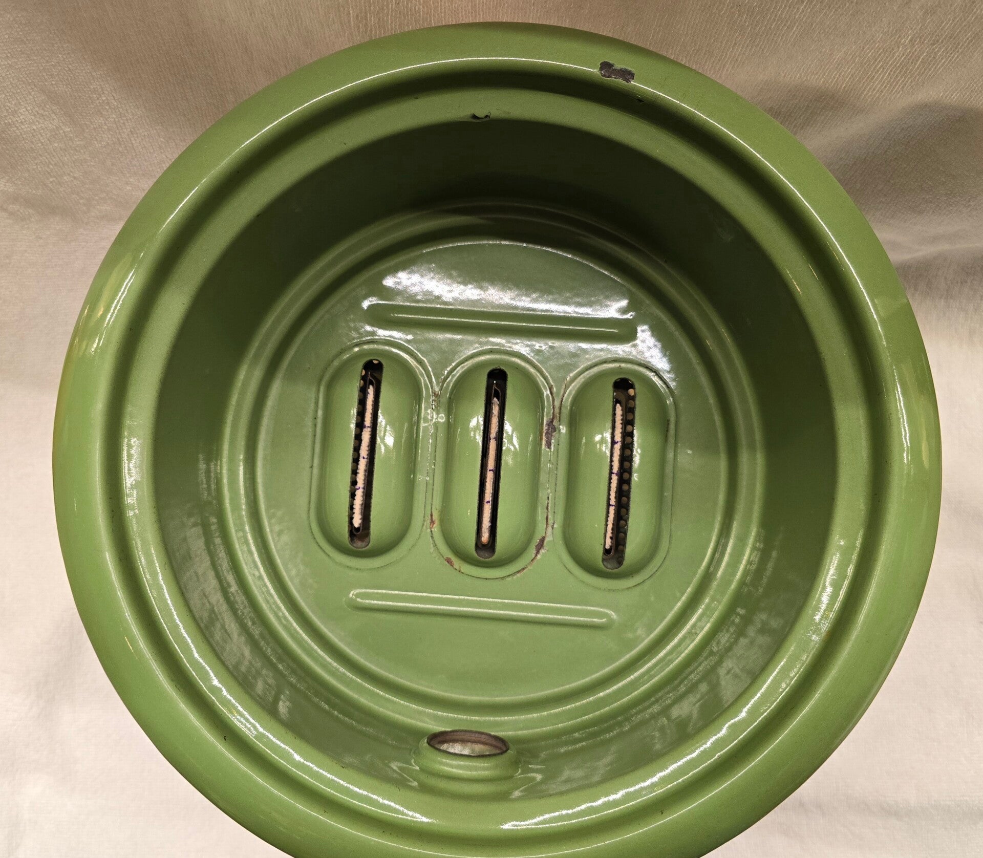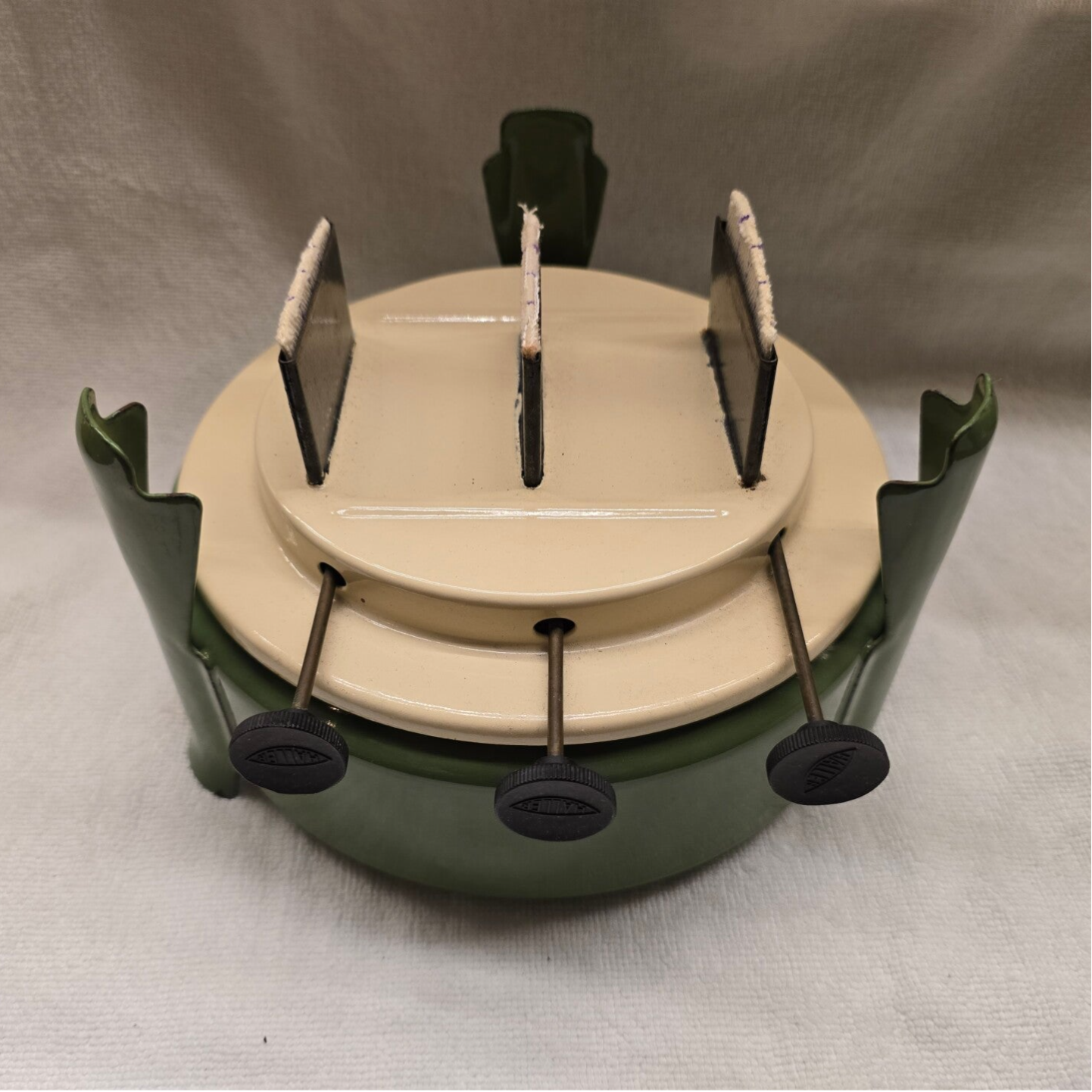 Dit petroleumstel heeft wat roest op het rekje. Dit heeft geen invloed op de stabiliteit van het rekje. Aan de binnenkant van het bovenste deel zitten wat kleine beschadigingen. Rondom de rand van het bovenste deel, zitten op de bovenkant en aan de onderkant wat kleine beschadigingen. Op de onderkant vna het bovenste deel zitten een aantal beschadigingen. Onder de pitten zitten wat roest plekjes. Dit heeft geen invloed op het functioneren van de pitten. Op de pootjes zitten op de bovenkant en aan de onderkant wat kleine beschadigingen en roest plekjes. Dit heeft geen invloed op de stabiliteit van het petroleumstel.