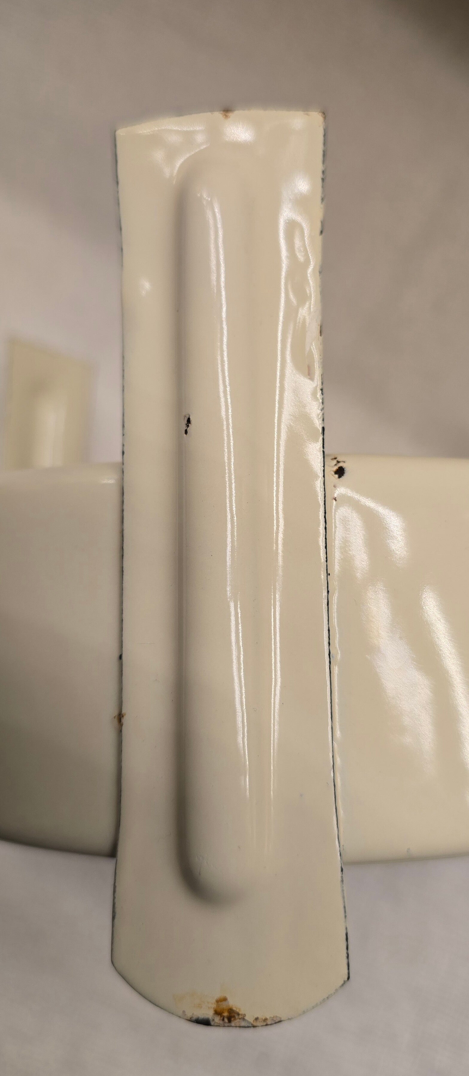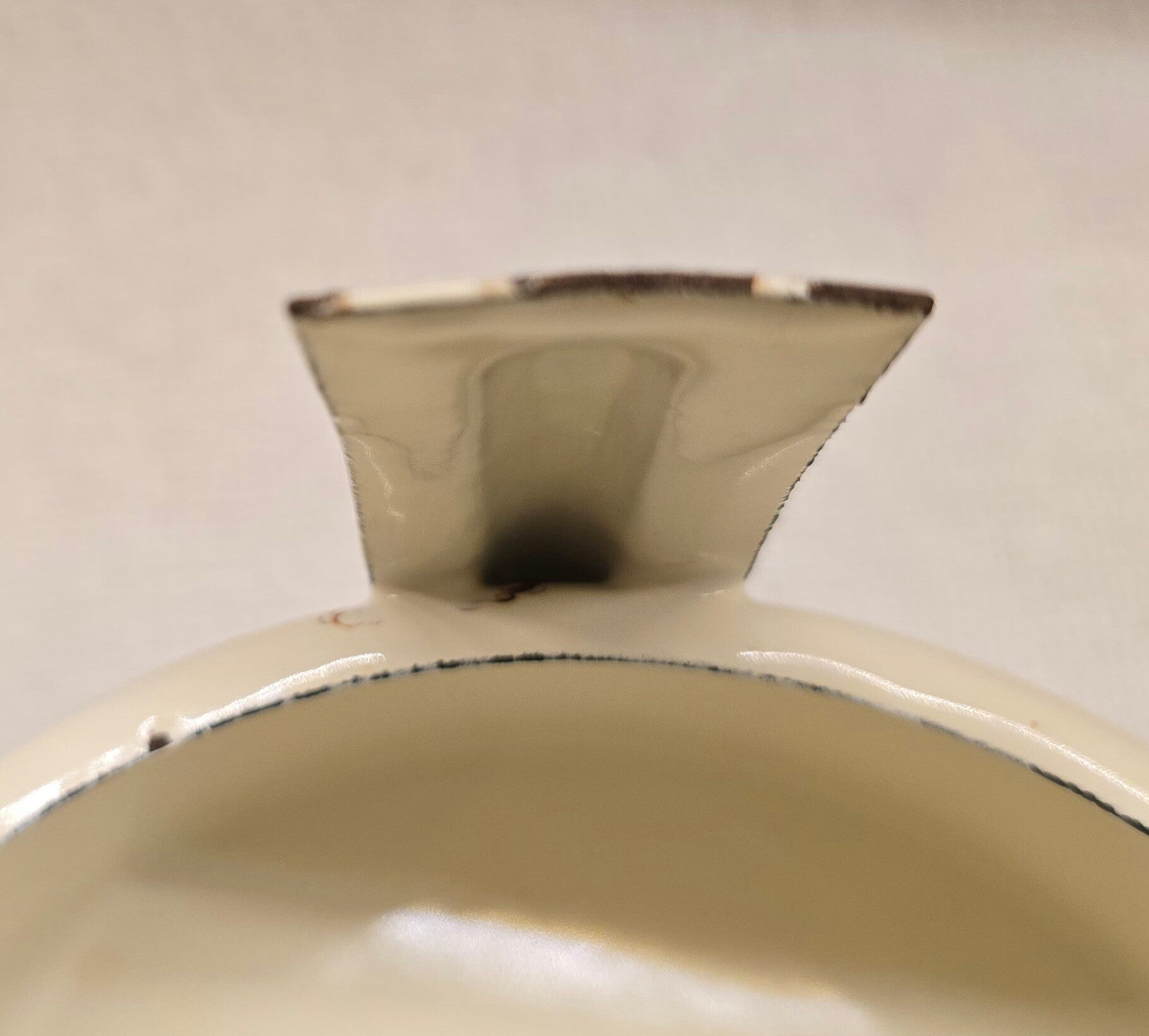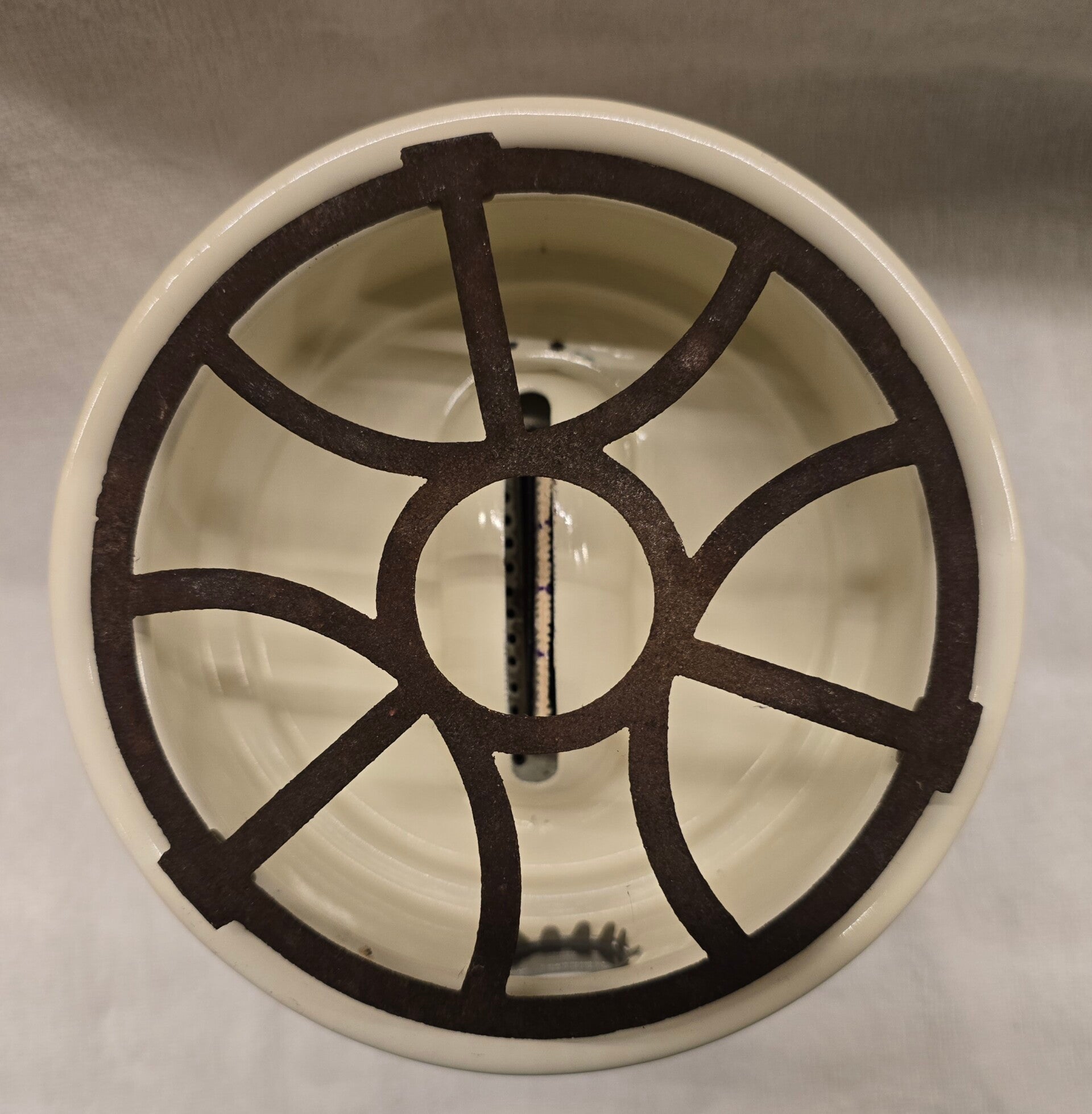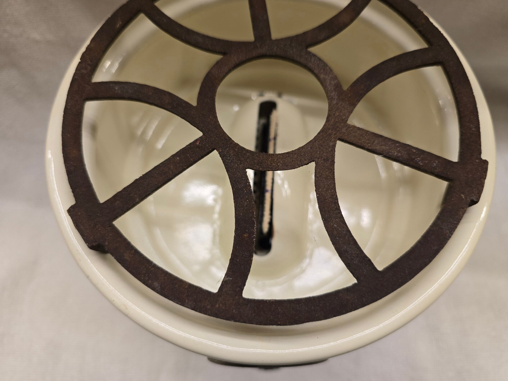Dit petroleumstel heeft wat roest op het rekje. Dit heeft geen invloed op de stabiliteit van het rekje. Op de achterkant van het bovenste deel zit een beschadiging. Op de pit zitten rondom een aantal kleine roest plekjes. Dit heeft geen invloed op het functioneren van de pit. Op de pootjes zitten op de bovenkant, aan de zijkant en aan onderkant wat roest plekjes. Dit heeft geen invloed op de stabiliteit van het petroleumstel.