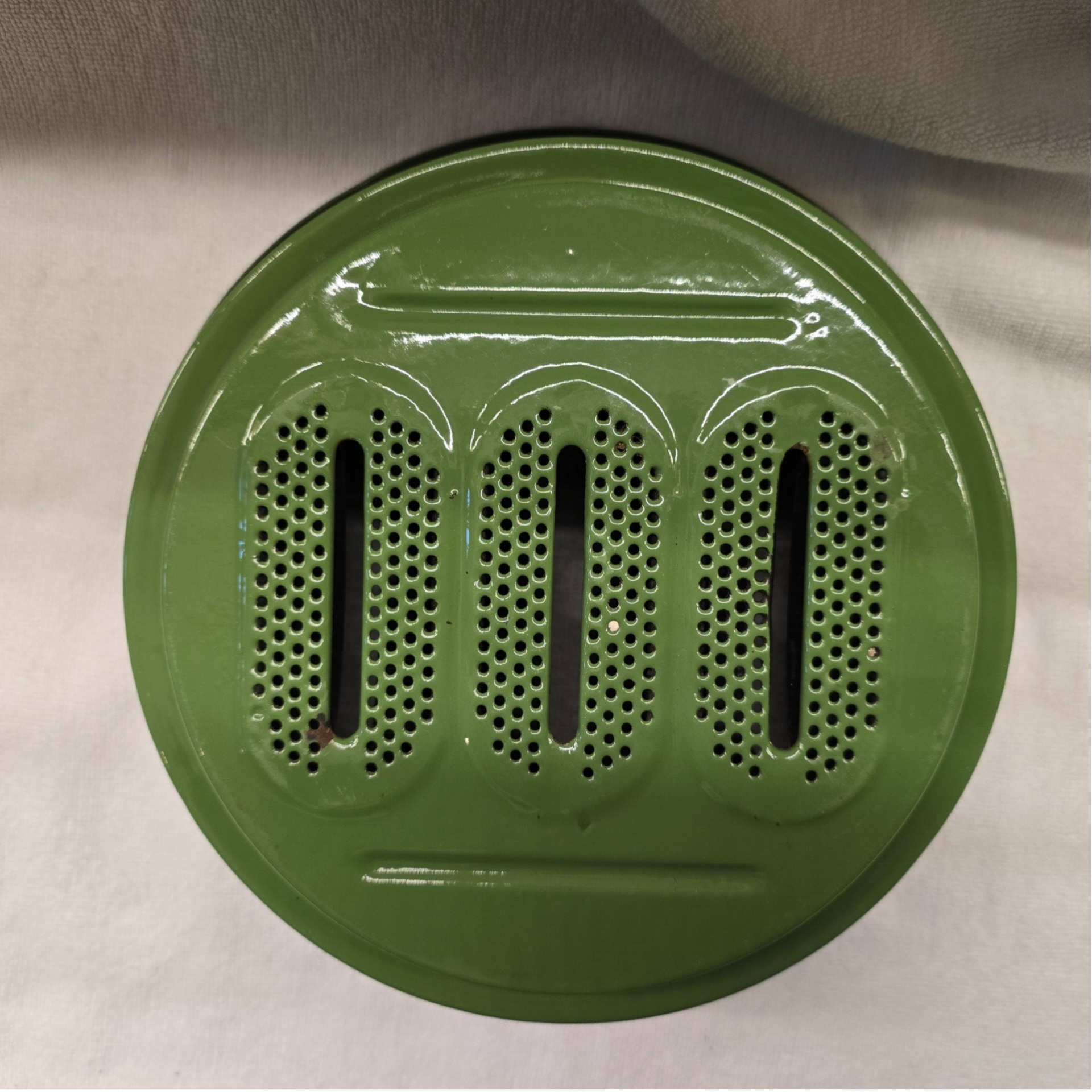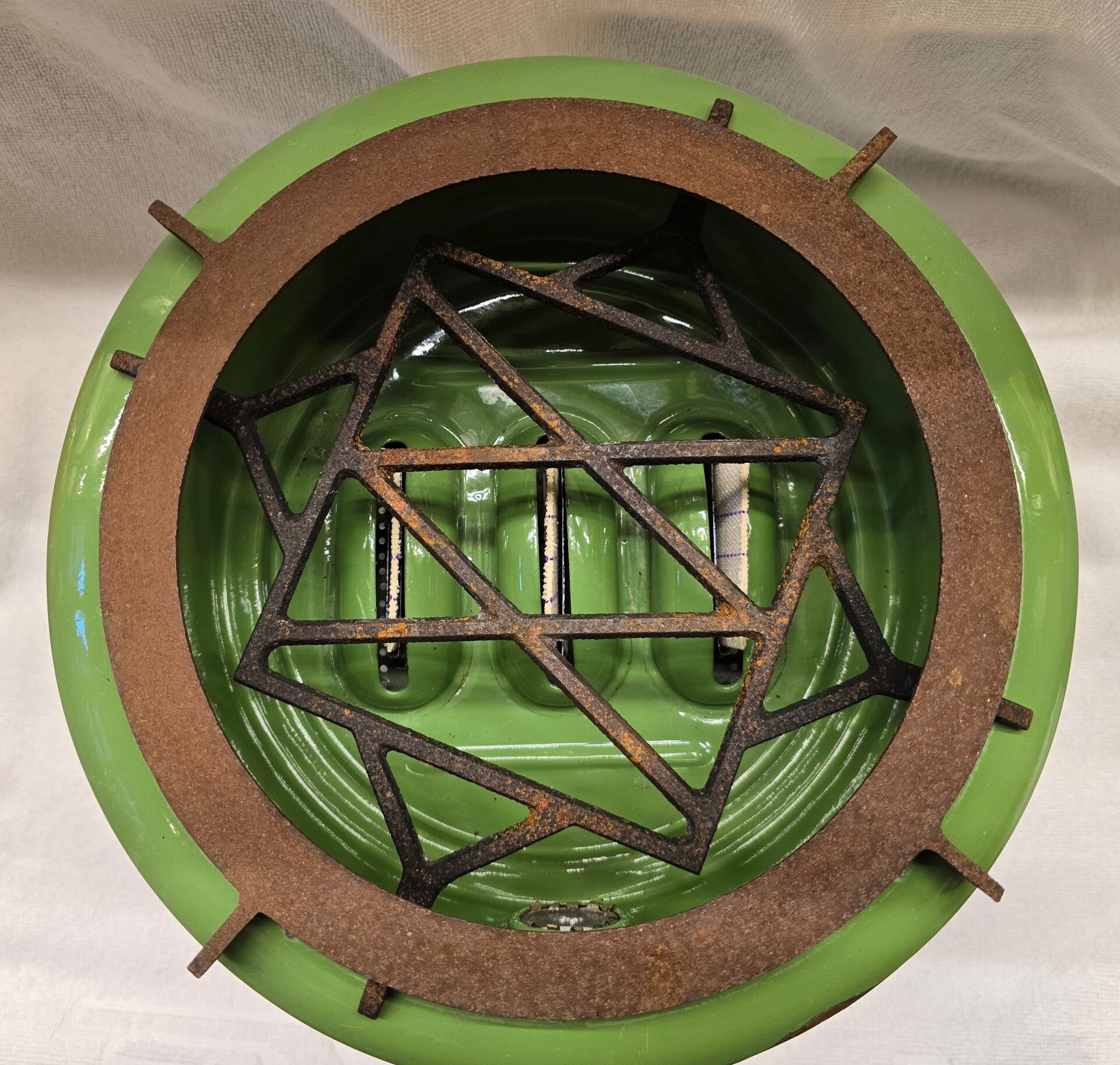 Dit petroleumstel heeft wat roest op de rekjes. Dit heeft geen invloed op de stabiliteit van de rekjes. Aan de binnenkant van het bovenste deel heeft wat roest plekjes en kleine beschadigingen. Op de rand van het bovenste deel zit een beschadiging. Onder de rand van het bovenste deel zit een aantal kleine plekjes. Op de onderkant van het bovenste deel zitten een aantal kleine beschadigingen. Bovenop de pitten zitten aan de rand en tussen de pitten een paar beschadigingen. Op onderkant van de pitten zitten roest plekjes. Dit heeft geen invloed op het functioneren van de pitten.