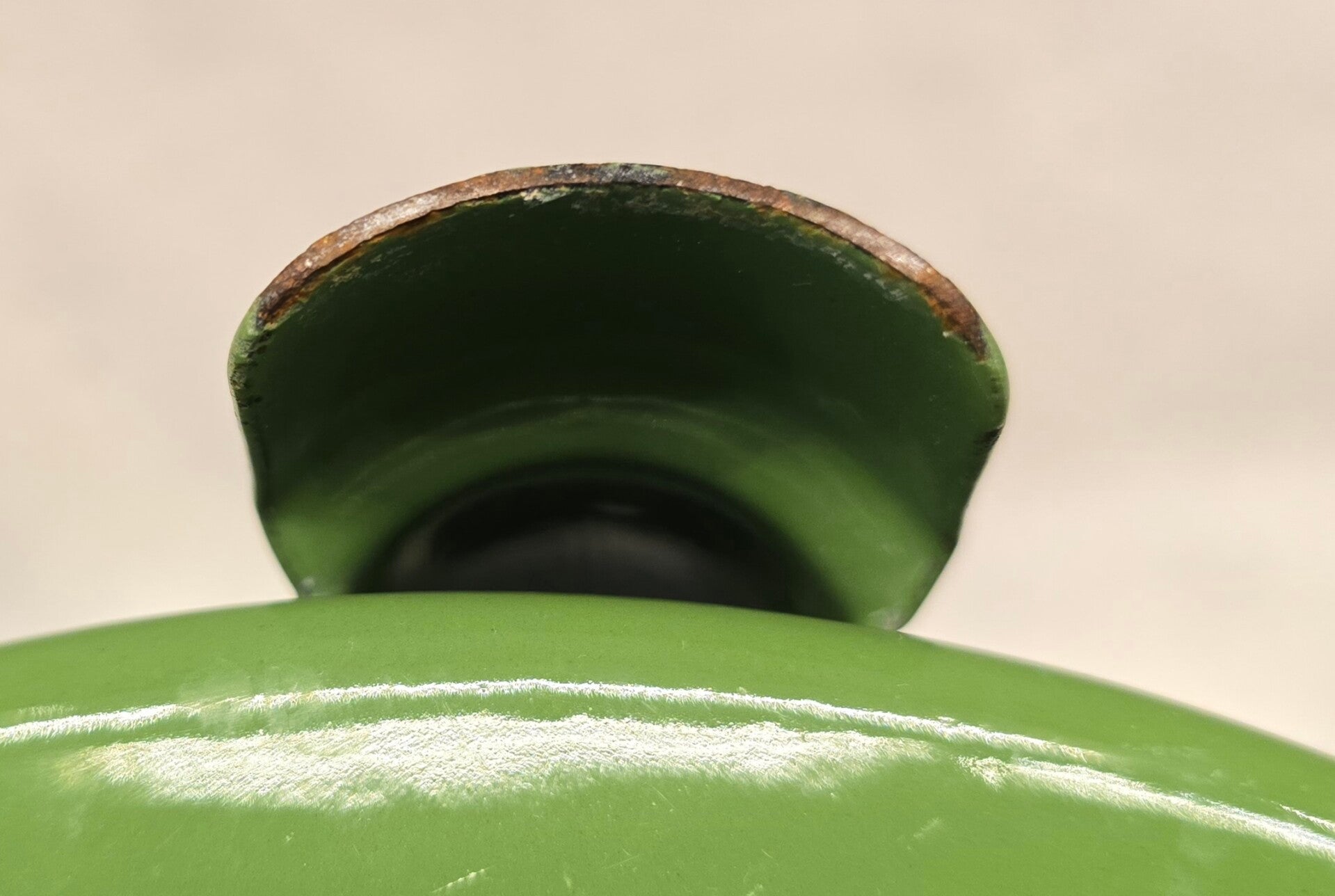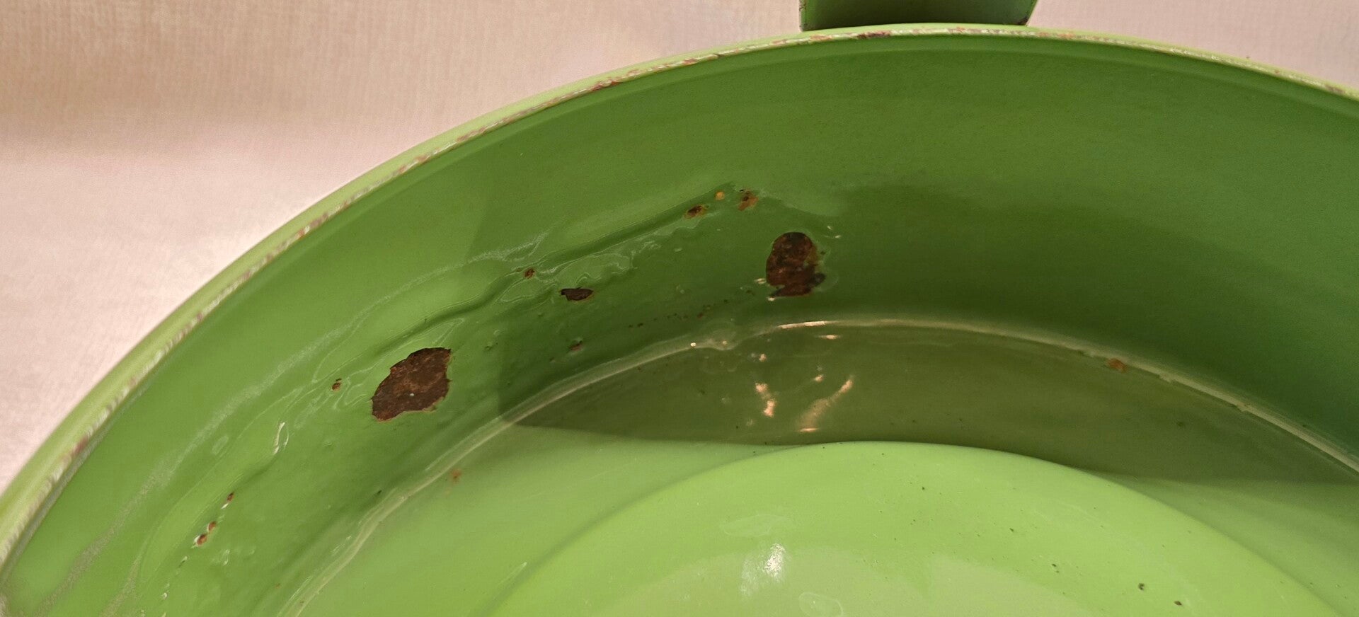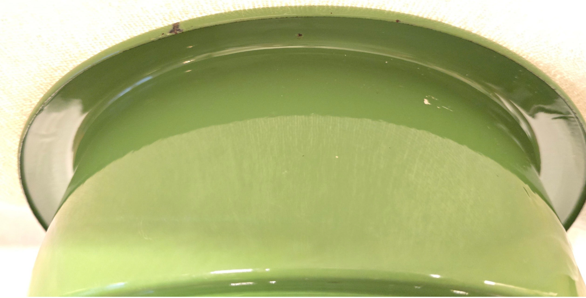 Aan de rand van het onderste deel zitten een paar kleine beschadigingen. Aan de binnenkant van het onderste deel zitten twee beschadigingen en wat oneffenheden in het emaille. Dit heeft geen invloed op de bodem of de zijkanten. Dit kan niet gaan lekken. Op de pootjes zitten op de bovenkant en aan de onderkant wat plekjes. Dit heeft geen invloed op de stabiliteit van het petroleumstel.