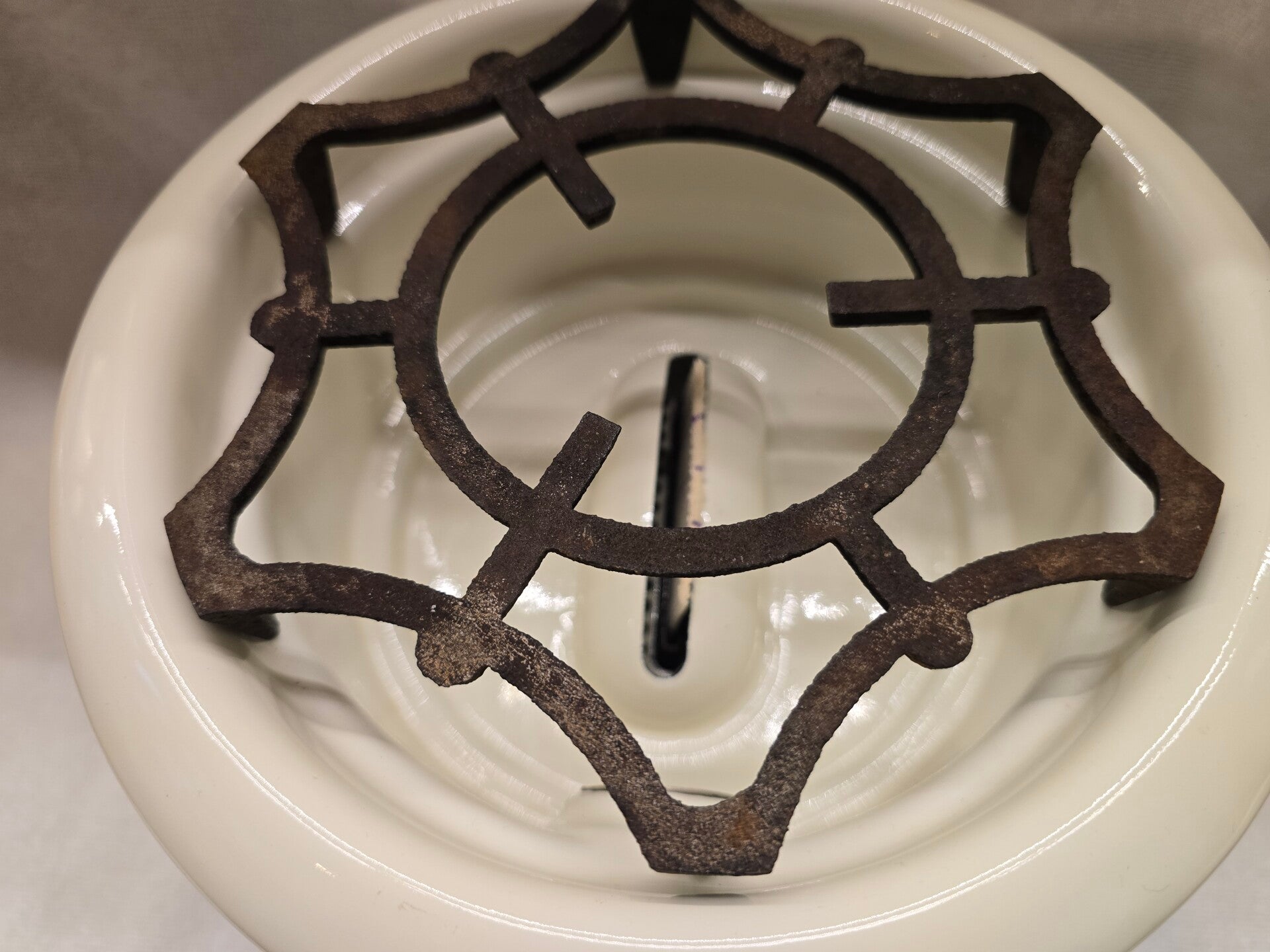 Dit petroleumstel heeft wat roest op het rekje. Dit heeft geen invloed op de stabiliteit van het rekje. Op de pootjes zitten op de bovenkant en aan de onderkant wat plekjes. Dit heeft geen invloed op de stabiliteit van het petroleumstel. Dit petroleumstel is in een hele mooie staat en ziet er bijna als nieuw uit!