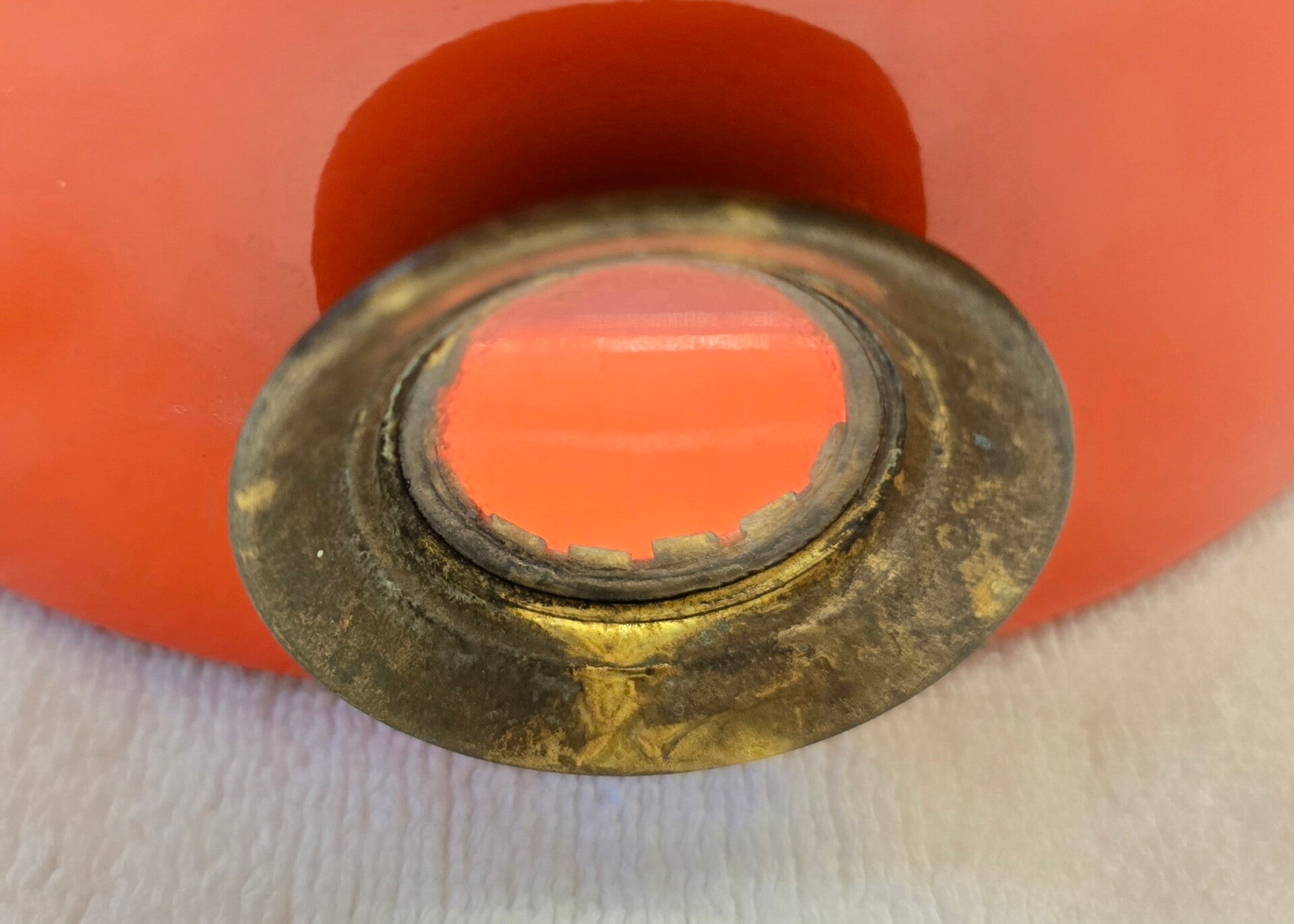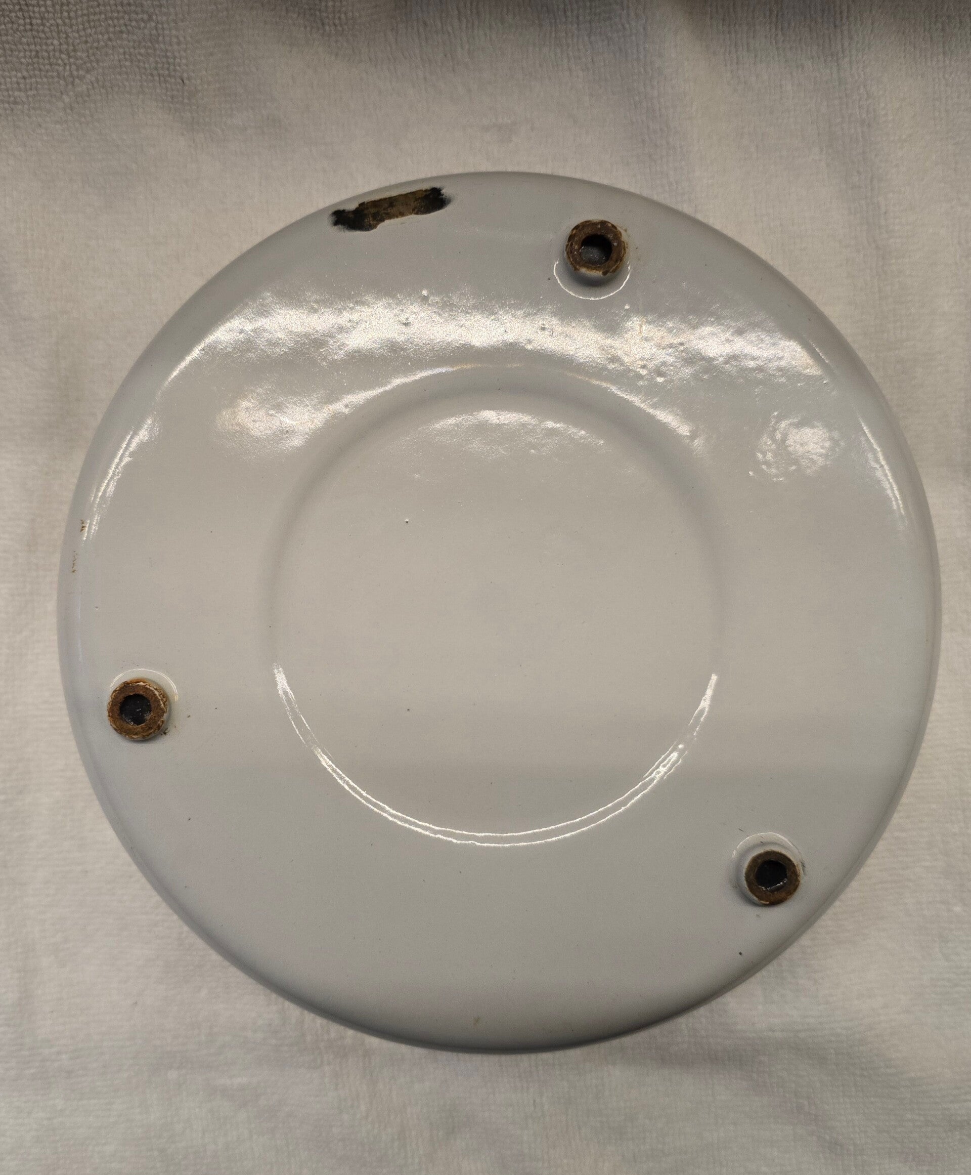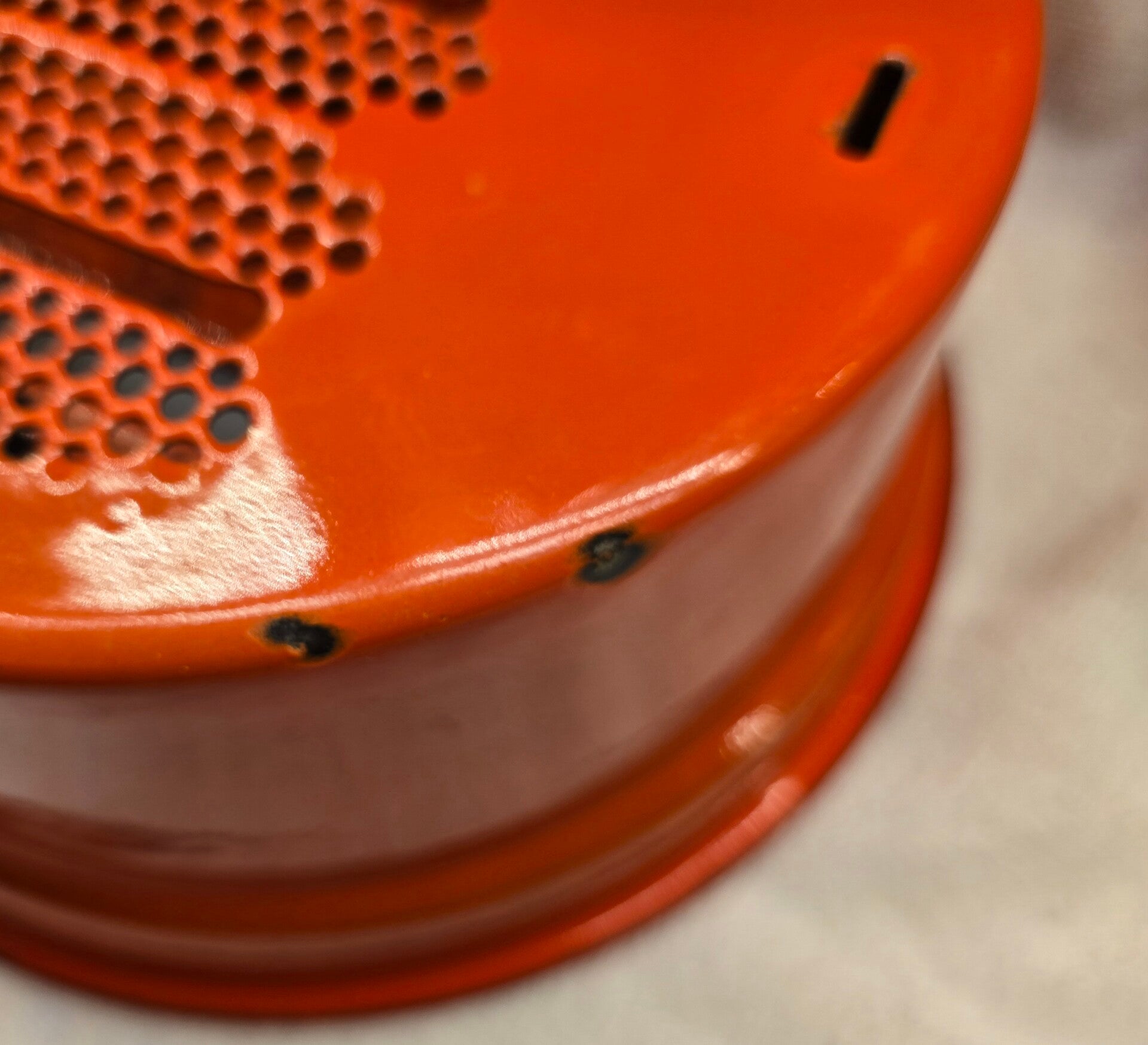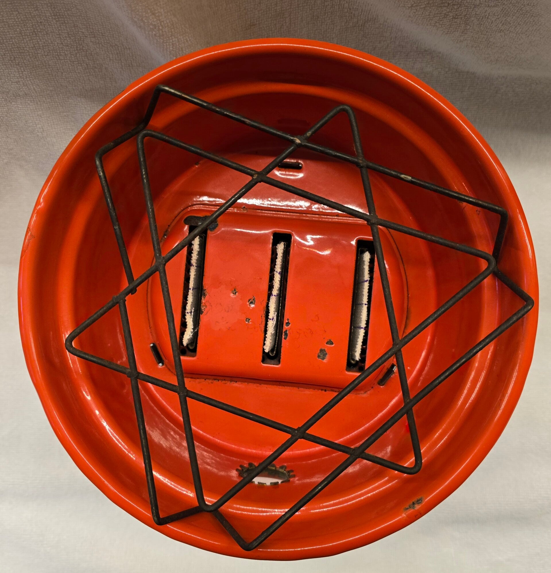 Dit petroleumstel heeft wat roest op het rekje. Dit heeft geen invloed op de stabiliteit van het rekje. Aan de rand van het bovenste deel zit een kleine beschadiging. Aan de binnenkant zitten een aantal kleine beschadigingen. Op de onderkant zitten een paar kleine beschadigingen. Onder de pit zitten een paar kleine plekjes en roest plekjes. Dit heeft geen invloed op het fucntioneren van de pitten. Rondom de rand van het onderste deel zitten een paar kleine roest plekjes en beschadigingen. Aan de binnenkant zit een heel klein roest plekje. Dit heeft geen invloed op de bodem. Dit kan niet gaan lekken. Op de onderkant zit een beschadiging. Dit heeft geen invloed op de bodem. Dit kan niet gaan lekken.