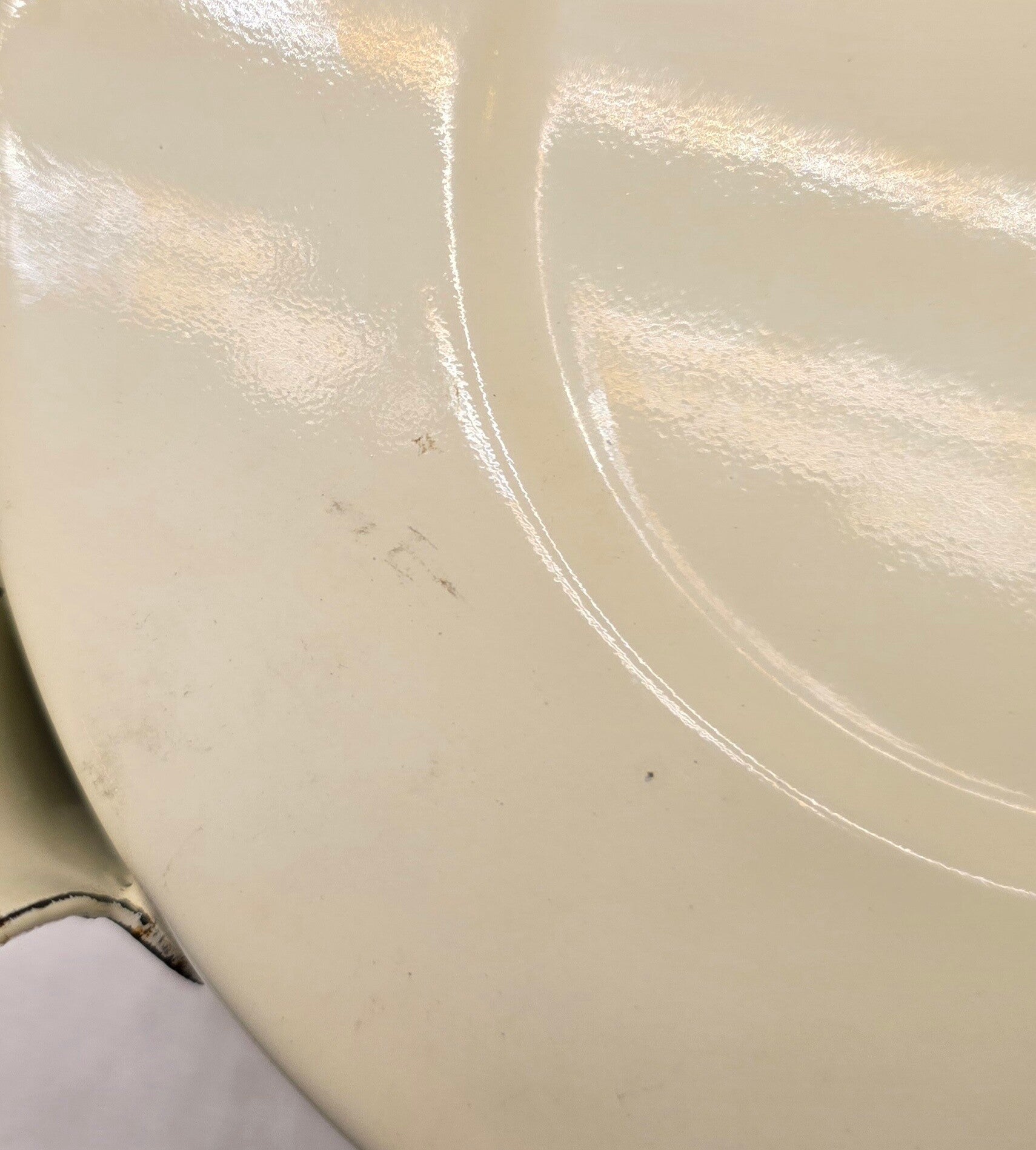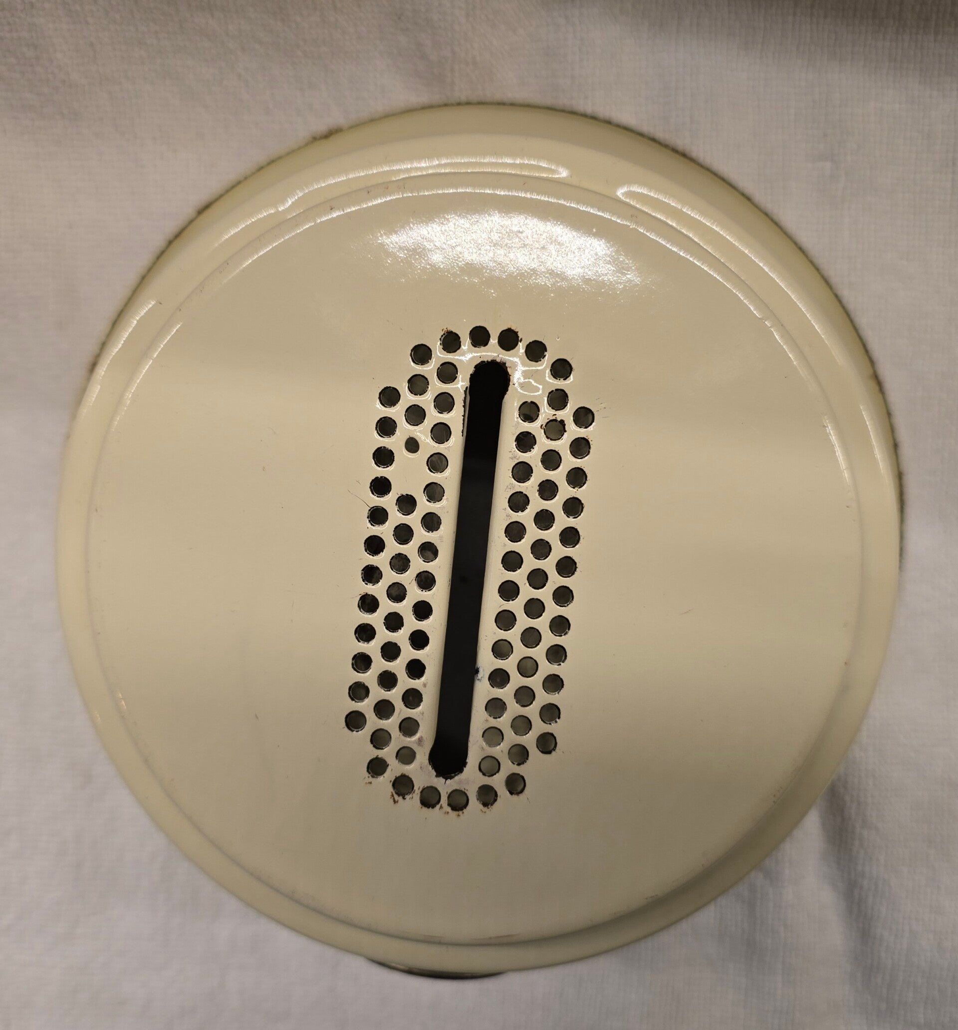 Er zit wat roest op het rekje. Dit heeft geen invloed op het stabiliteit van het rekje. Onder de rand zitten een aantal roest plekjes. Aan de achterkant van de pit zit een kleine beschadiging. Onder de pit zitten wat roest plekjes. Dit heeft geen invloed op het functioneren van de pit. Op de onderkant van het onderste deel zitten wat krasjes in het emaille. Dit heeft geen invloed op de bodem. Op de pootjes zitten op de bovenkant en aan de onderkant wat roest plekjes. Dit heeft geen invloed op de stabiliteit van het petroleumstel.