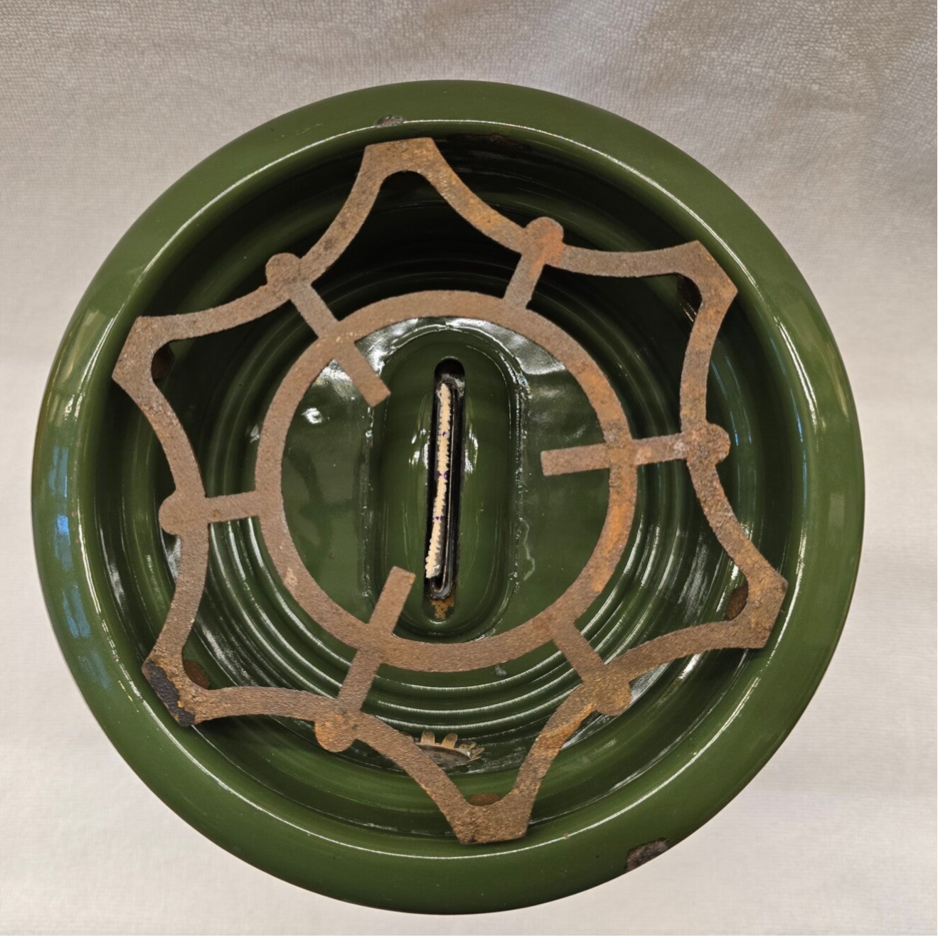 Dit petroleumstel heeft wat roest op het rekje. Dit heeft geen invloed op de stabilitieit van het rekje. Aan de buitenkant van de rand zit een beschadiging. Aan de binnenkant van het bovenste deel zit een kleine beschadiging. Onder de rand van het bovenste deel zitten een aantal kleine beschadigingen. Op de onderkant van het bvoenste deel zitten een aantal kleine beschadigingen. Aan de rand van de pit zitten wat kleine roest plekjes. Onder de pit zitten wat roest plekjes. Dit heeft geen invloed op het functioneren van de pit. Aan de binnenkant van het onderste deel zit een kleine beschadiging. Dit heeft geen invloed op de bodem. Dit kan niet gaan lekken. Aan de rand van het onderste deel zitten kleine beschadigingen. Op de onderkant van het onderste deel zitten wat oneffenheden en een kleine beschdiging. Dit heeft geen invloed op de bodem. Dit kan niet gaan lekken. Op de pootjes zitten op de bovenkant, aan de zijkanten en aan de onderkant wat roest plekjes. Dit heeft geen invloed op de stabiliteit van het petroleumstel.