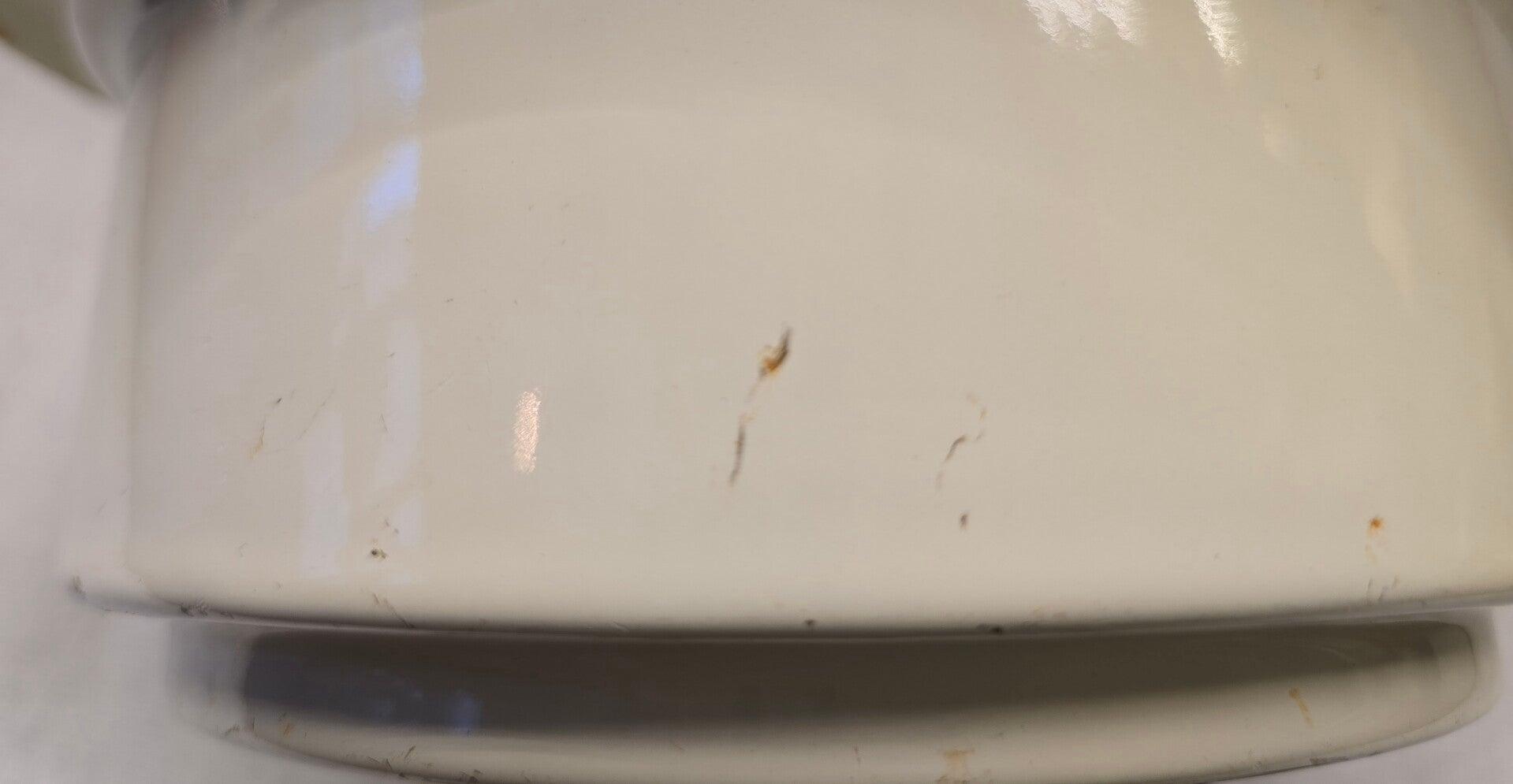 Dit petroleumstel heeft wat roest plekjes en kleine beschadigingen aan de binnenkant van het bovenste deel. Onder de rand van het bovenste deel zitten een aantal kleine beschadigingen. Aan de zijkant van het bovenste deel zitten krasjes in het emaille. Rondom de pit zitten aan de bovenkant en aan de onderkant wat roest plekjes en beschadigingen. Dit heeft geen invloed op het functioneren van de pit. Op de pootjes zitten op de zijkanten een aantal kleine beschadigingen en roest plekjes. Aan de binnenkant van een paar pootjes zitten wat kleine beschadigingen aan de binnenkant. Op de bovenkant en aan de onderkant zitten wat roest plekjes. Dit alles heeft geen invloed op de stabiliteit van het petroleumstel.