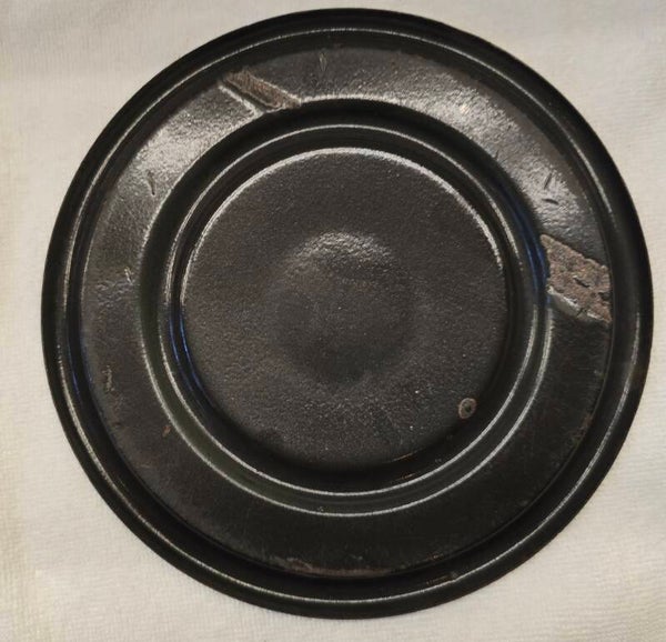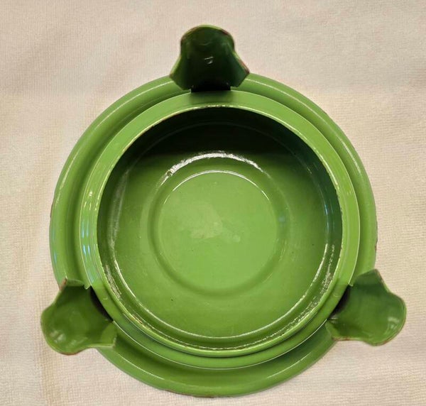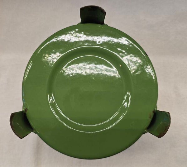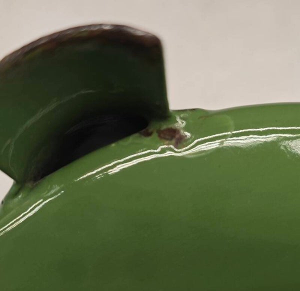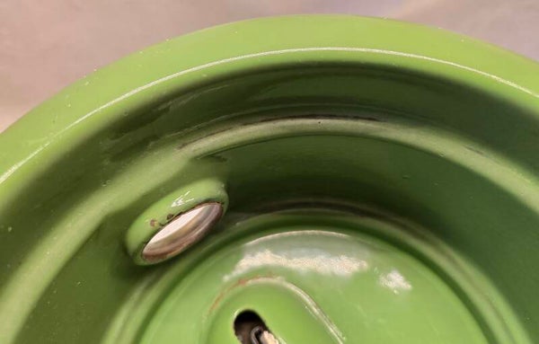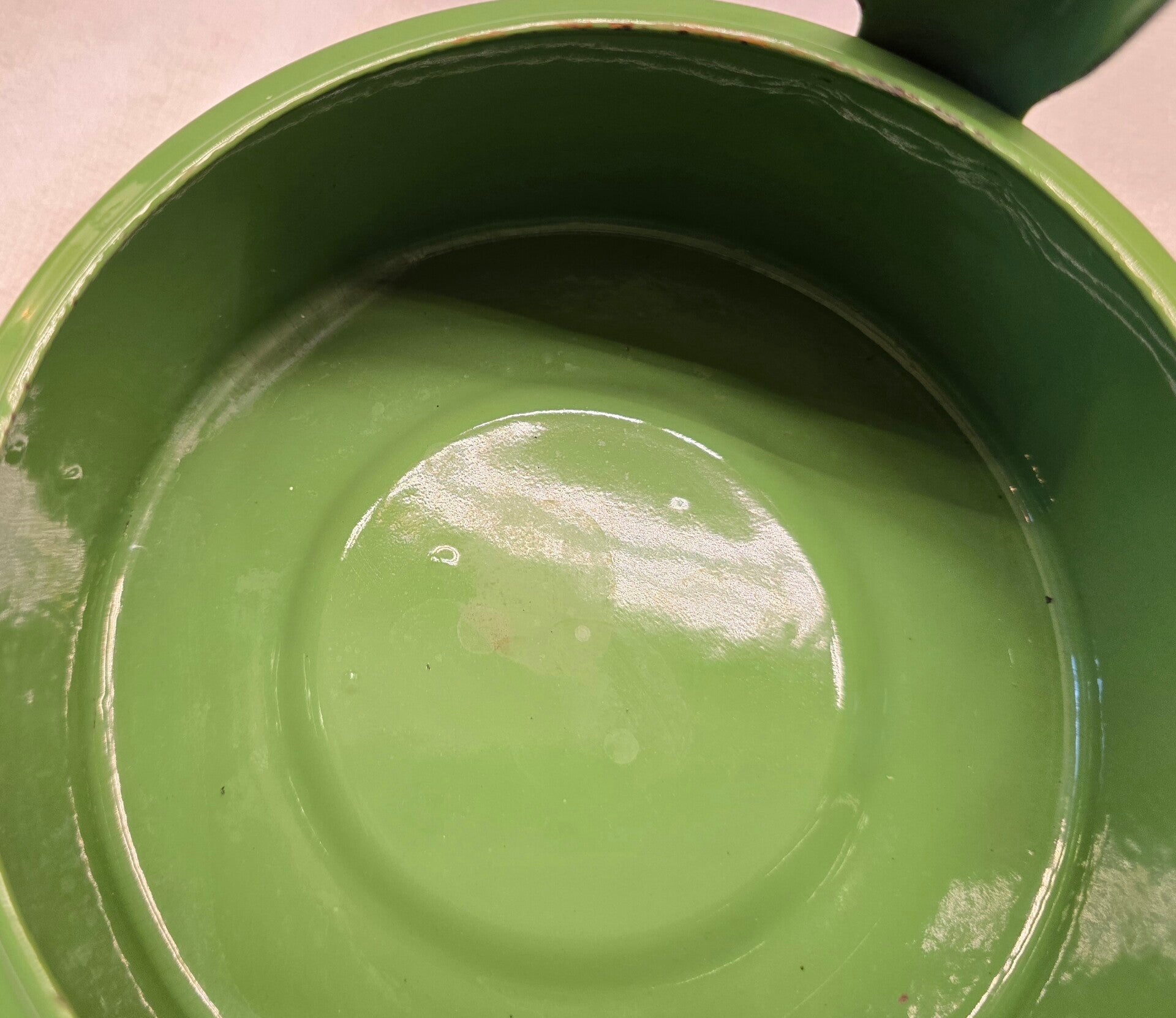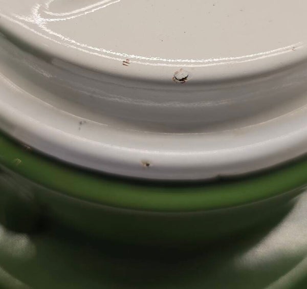 Aan de binnenkant van het onderste deel zitten wat waas en kleine plekjes. Dit heeft geen invloed op de bodem of zijkanten. Dit kan niet gaan lekken. Aan de onderkant van het onderste deel zit een klein plekje. Dit heeft geen invloed op de bodem. Dit kan niet gaan lekken. Op de pootjes zitten op de bovenkant en aan de onderkant wat roest plekjes. Dit heeft geen invloed op de stabiliteit van het petroleumstel. Het onderbord heeft bovenop, rondom de rand een aantal beschadigingen. Op de onderkant van het onderbord zitten een aantal beschadigingen. Dit heeft geen invloed op de stabiliteit van het onderbord.