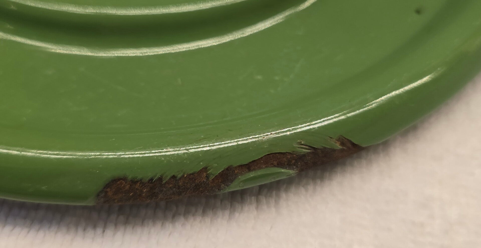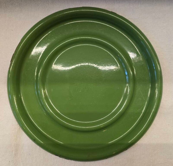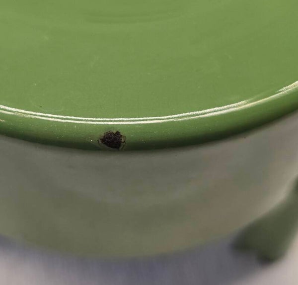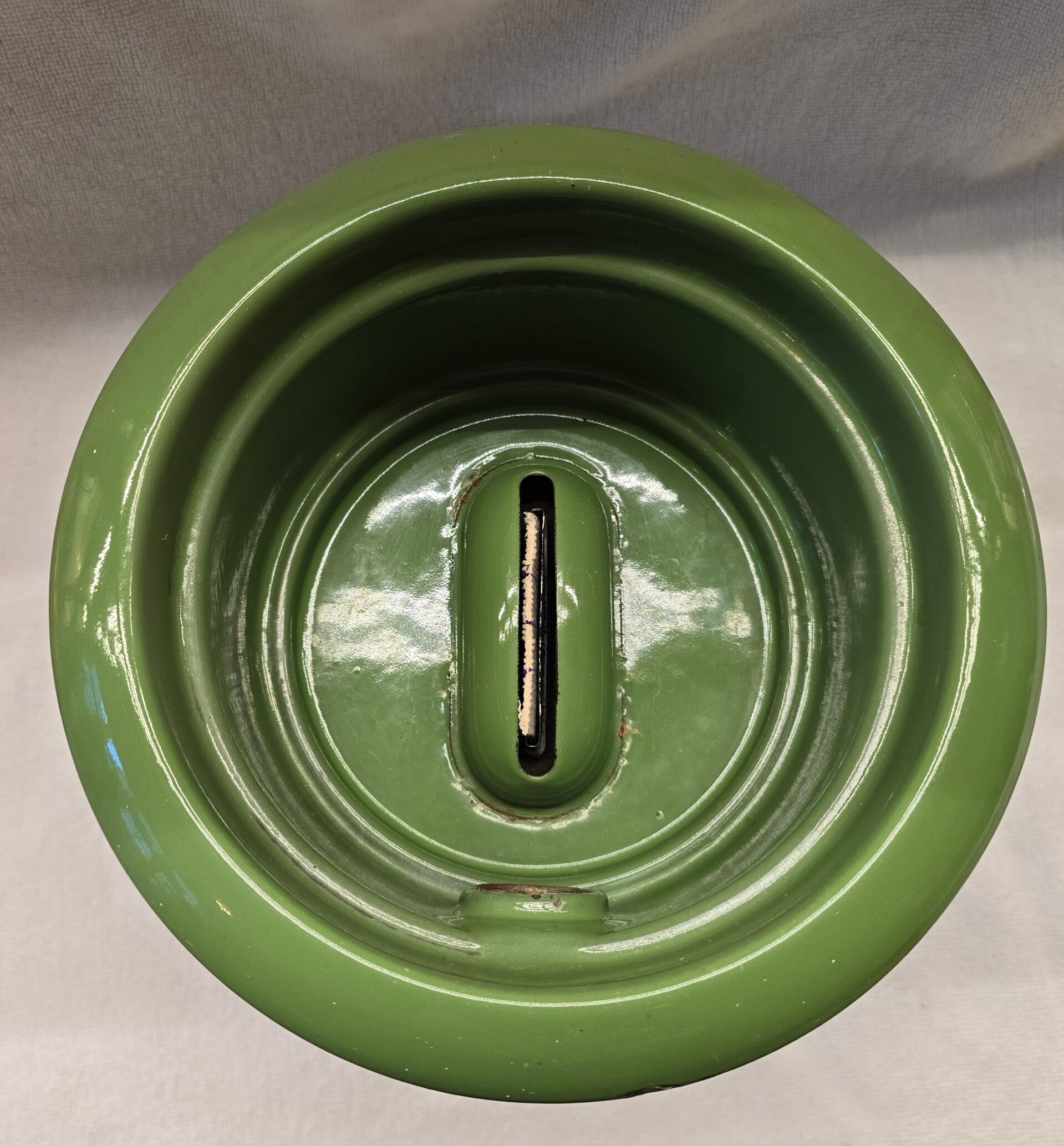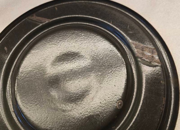 Aan de binnenkant van het onderste deel zitten wat waas en kleine plekjes. Dit heeft geen invloed op de bodem of zijkanten. Dit kan niet gaan lekken. Aan de onderkant van het onderste deel zit een klein plekje. Dit heeft geen invloed op de bodem. Dit kan niet gaan lekken. Op de pootjes zitten op de bovenkant en aan de onderkant wat roest plekjes. Dit heeft geen invloed op de stabiliteit van het petroleumstel. Het onderbord heeft bovenop, rondom de rand een aantal beschadigingen. Op de onderkant van het onderbord zitten een aantal beschadigingen. Dit heeft geen invloed op de stabiliteit van het onderbord.