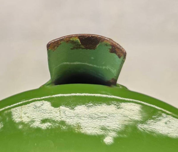 Dit petroleumstel heeft een paar kleine plekjes aan het rekje. Dit heeft geen invloed op de stabiliteit van het rekje. Aan de rand van het bovenste deel zitten een paar beschadigingen. Aan de binnenkant van het bovenste deel zitten wat kleine roest plekjes en wat waas. Aan de onderkant van het bovenste deel zitten een paar kleine plekjes. Bovenop de pit zitten een paar kleine beschadigingen. Rondom de randen van de pit zitten een aantal kleine beschadigingen. Onder de pit zitten wat roest plekjes. Dit heeft geen invloed op het functioneren van de pit.