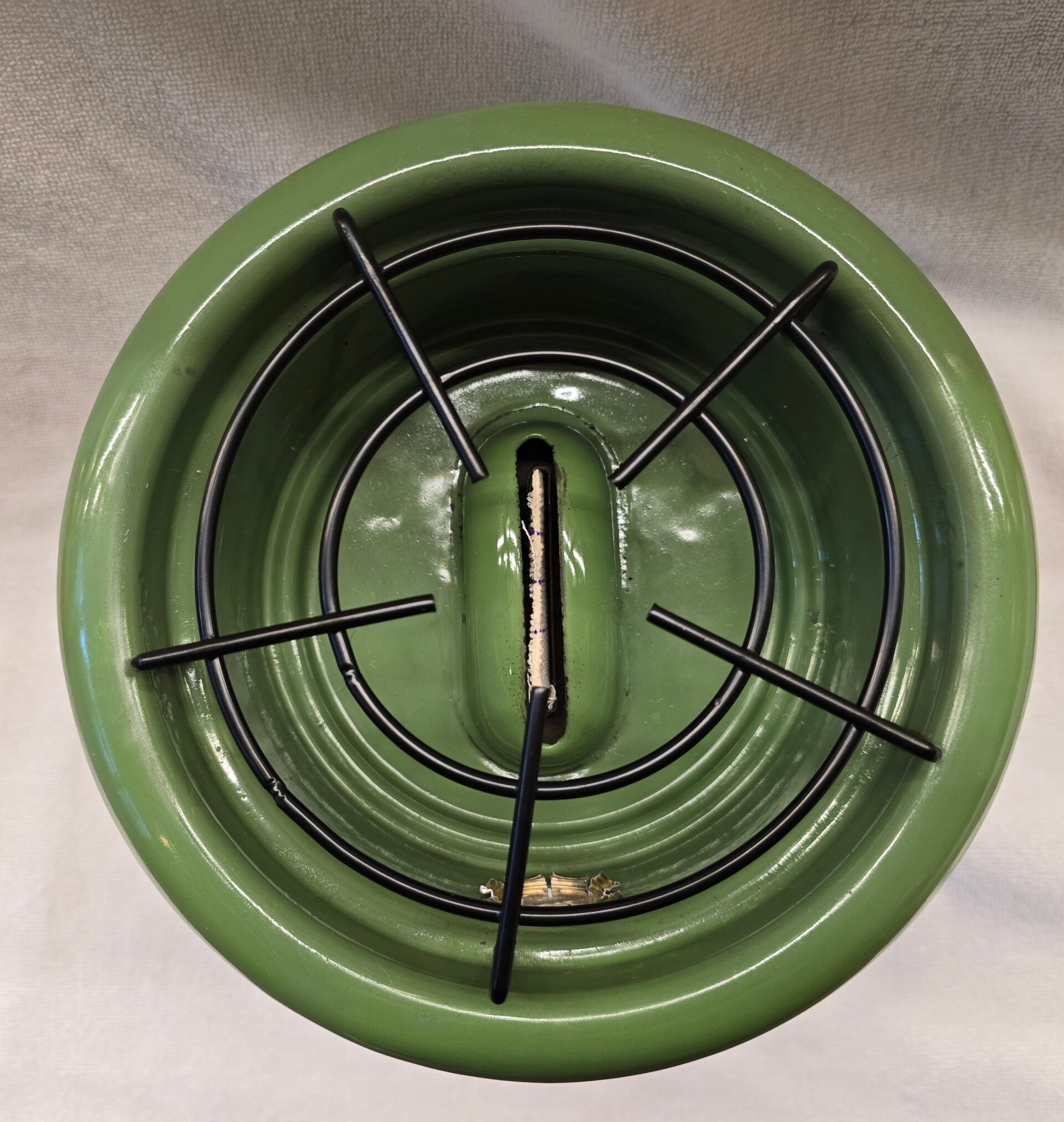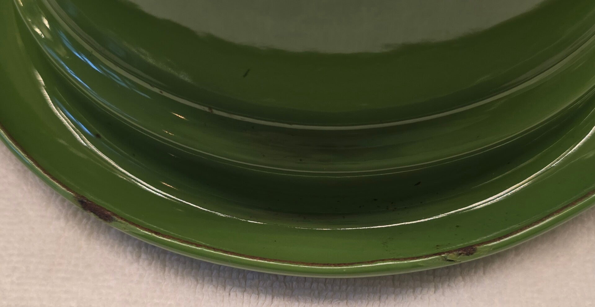 Aan de binnenkant van het bovenste deel zit een kleine beschadiging. Onder de rand van het bovenste deel zitten rondom beschadigingen. Aan de onderkant van het bovenste deel zitten een paar kleine plekjes. Op het knopje van de pit zit wat waas. Op de bovenkant van de pit zit wat groene waas. Emaille is handwerk en kan daardoor wat oneffenheden bevatten. Hier hebben wij helaas geen invloed op. Rondom de pit zitten aan de rand een aantal roest plekjes en beschadigingen. Onder de pit zitten een aantal roest plekjes. Dit heeft geen invloed op het functioneren van de pit. Aan de zijkanten van het onderste deel zitten twee beschadigingen. Dit heeft geen invloed op de zijkanten of de bodem. Dit kan niet gaan lekken. Op de pootjes zitten op de bovenkant en aan de onderkant wat roest. Dit heeft geen invloed op de stabiliteit van het petroleumstel.