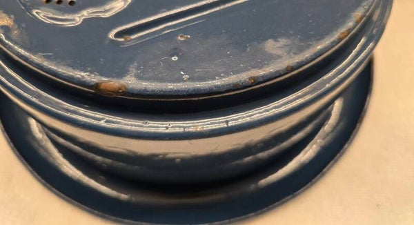 Dit petroleumstel heeft wat roest op het rekje. Dit heeft geen invloed op de stabiliteit van het rekje. Aan de binnenkant van het bovenste deel zitten wat beschadigingen en roest plekken. Rondom, onder de rand van het bovenste deel zitten een aantal beschadigingen. Aan de onderkant van het bovenste deel zitten een aantal roest plekken en beschadigingen. Rondom de pitten zitten roest plekjes en beschadigen. Onder de pitten zitten roest plekjes. Dit heeft geen invloed op het functioneren van de pitten. Aan de rand van het onderste deel zitten een aantal beschadingen en roest plekken. Aan de onderkant van één van de pootjes zit een beschadiging. Dit heeft geen invloed op de stabiliteit van het petroleumstel. Op de pootjes zitten op de bovenkant en aan de onderkant wat roest plekjes en kleine beschadigingen. Dit heeft geen invloed op de stabiliteit van het petroleumstel.