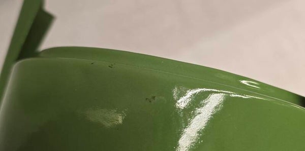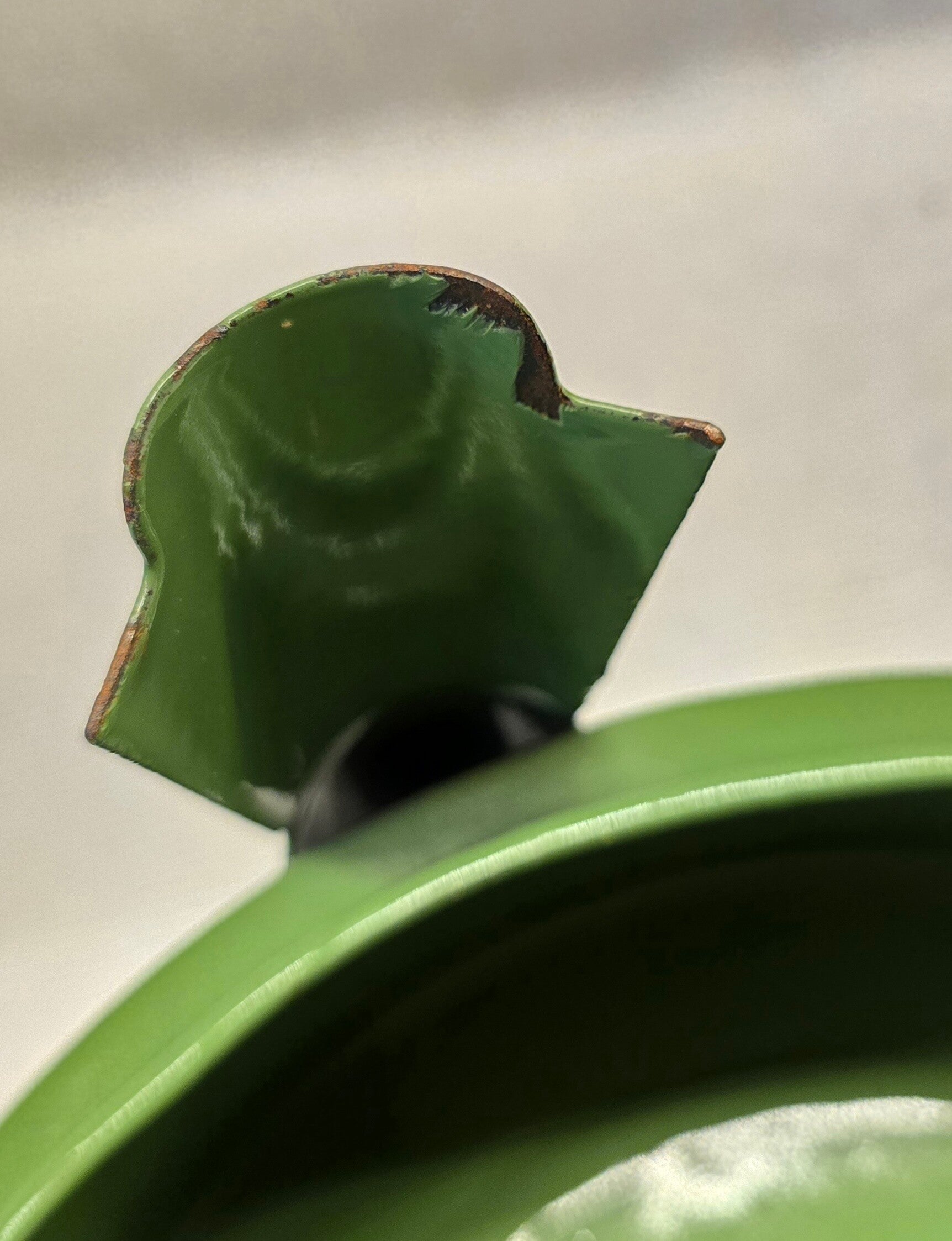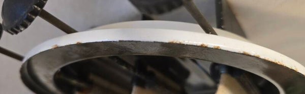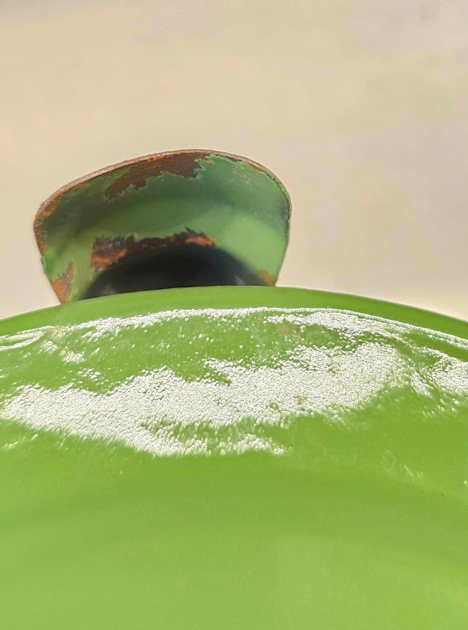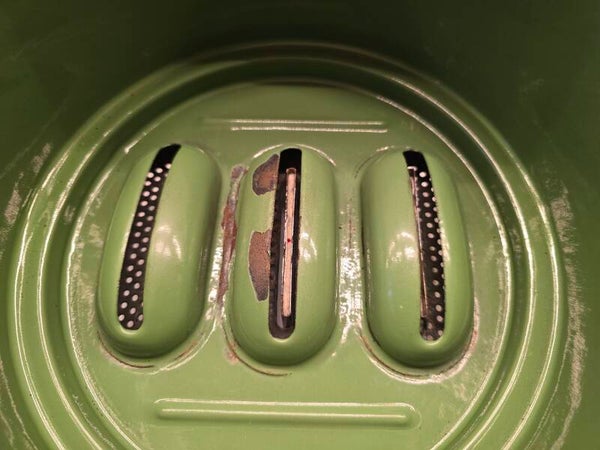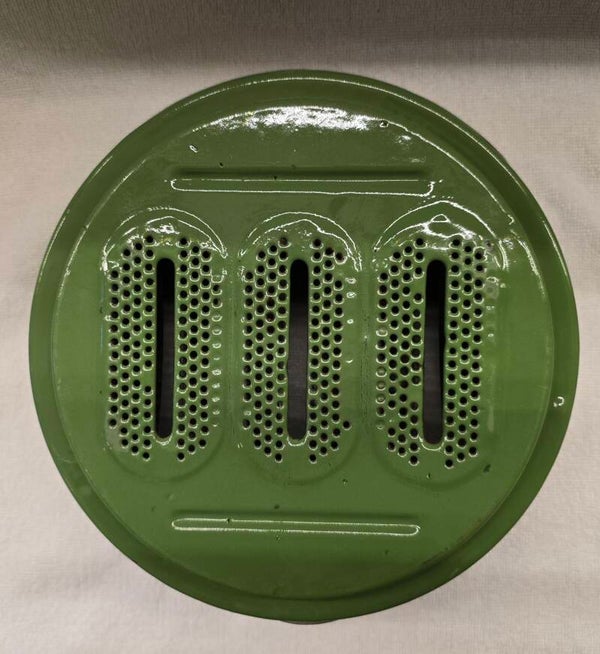 Dit petroleumstel heeft wat roest op het rekje. Dit heeft geen invloed op de stabiliteit van het rekje. Aan de binnenkant van het bovenste deel zitten een aantal beschadigingen. Onder de rand van het bovenste deel zitten een aantal beschadigingen. Op de onderkant van het bovenste deel zit een klein plekje. Bovenop de pitten zitten een paar kleine beschadigingen. Rondom de rand van de pitten zitten een aantal beschadigingen. Op de onderkant van de pitten zitten wat roest plekjes. Dit heeft geen invloed op het functioneren van de pitten. Op de zijkant van het onderste deel zitten een paar krasjes in het emaille. Op één van de pootjes zit een beschadiging. Dit heeft geen invloed op de stabiliteit van het petroleumstel. Op de pootjes zitten op de bovenkant en aan de onderkant wat roest plekjes. Dt heeft geen invloed op de stabiliteit van het petroleumstel.