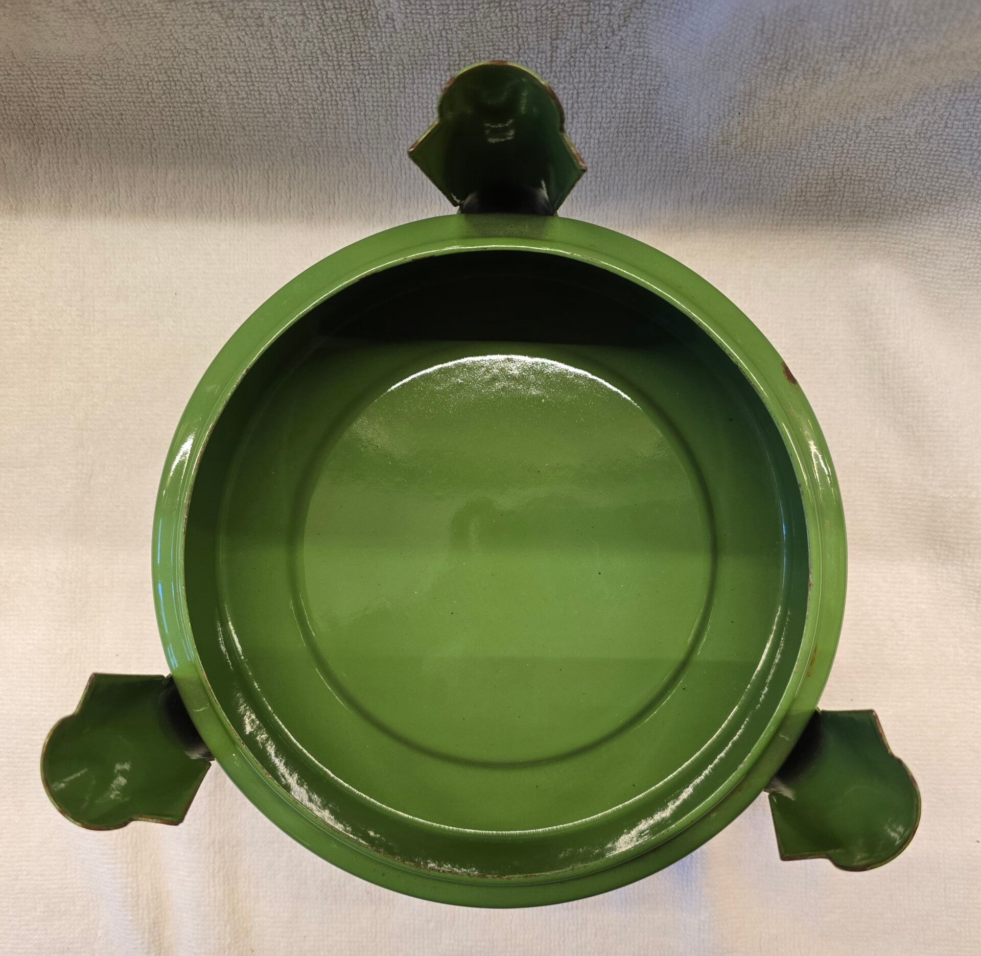 Dit petroleumstel heeft wat roest op de rekjes. Dit heeft geen invloed op de stabiliteit van de rekjes. Aan de binnenkant van het bovenste deel zitten wat beschadigingen en roest plekjes. Op de onderkant van het bovenste deel zitten een aantal roest plekjes en beschadigingen. Bovenop de pitten zitten een paar roest plekjes en hele kleine plekjes. Op de achterkant van de pitten zit wat waas. Aan de onderkant van de pitten zitten wat roest plekjes. Dit heeft geen invloed op het functioneren van de pitten. Rondom de rand van het onderste deel zitten een aantal kleine roest plekjes. Op de zijkant van het onderste deel zit een kleine beschadiging. Dit heeft geen invloed op de zijkant. Dit kan niet gaan lekken. Op de pootjes zitten op de bovenkant en aan de onderkant wat roest. Dit heeft geen invloed op de stabiliteit van het petroleumstel.