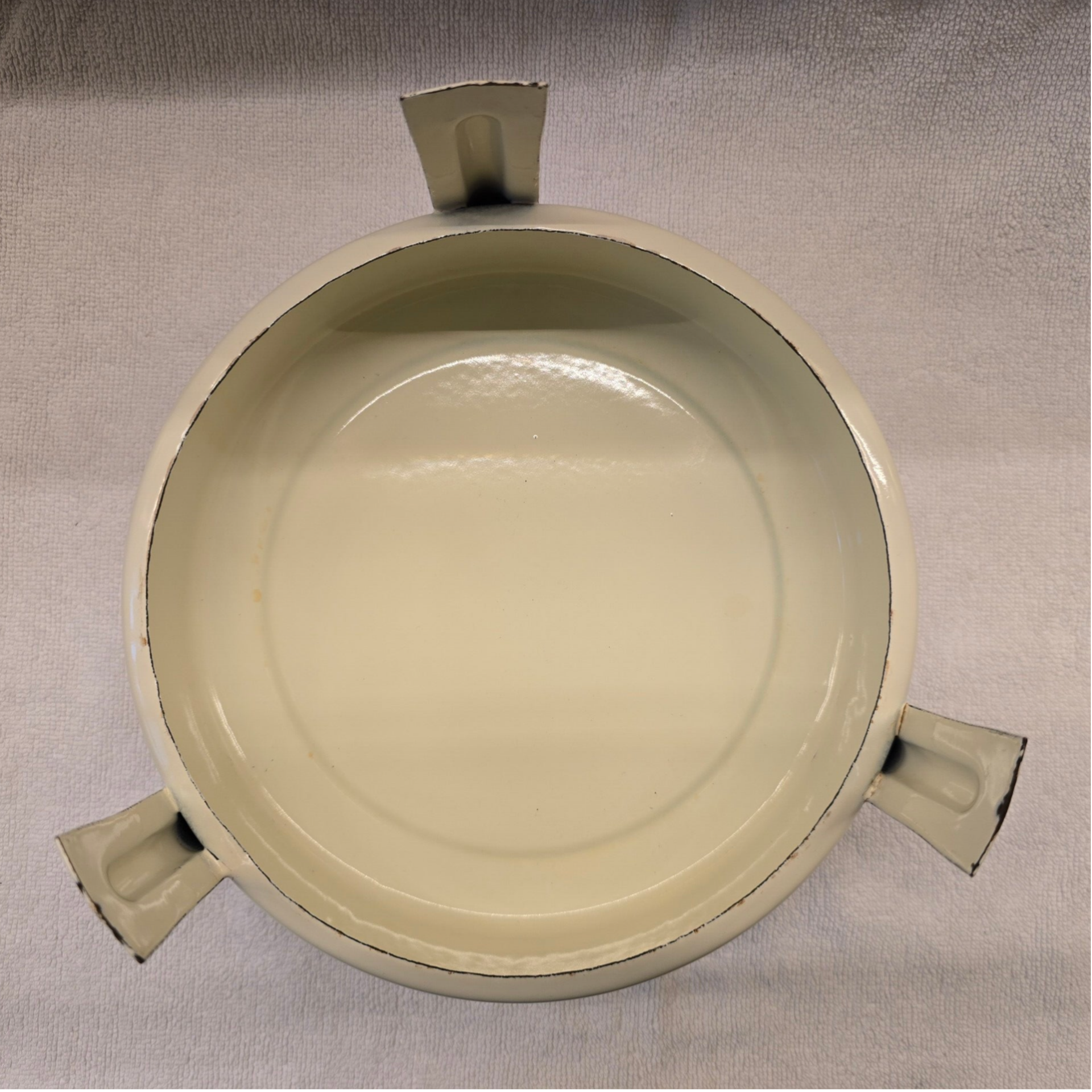 Dit petroleumstel heeft wat roest op het rekje. Dit heeft geen invloed op de stabiliteit van het rekje. Op de onderkant van het bovenste deel zitten een paar kleine plekjes. Op de zijkanten bij de pitten zitten wat oneffenheden in het emaille. Emaille is handwerk en kan daardoor wat oneffheden bevatten. Hier hebben wij helaas geen invloed op. Op de rand en aan de binnenkant van het onderste deel zitten een paar kleine roest plekjes en één klein plekje op de bodem. Dit heeft geen invloed op de bodem. Dit kan niet gaan lekken. Aan de buitekant van het onderste deel zitten een paar krasjes in het emaille. Op de pootjes zitten op de bovenkant en aan de onderkant wat kleine beschadigingen en roest. Dit heeft geen invloed op de stabiliteit van het petroleumstel.