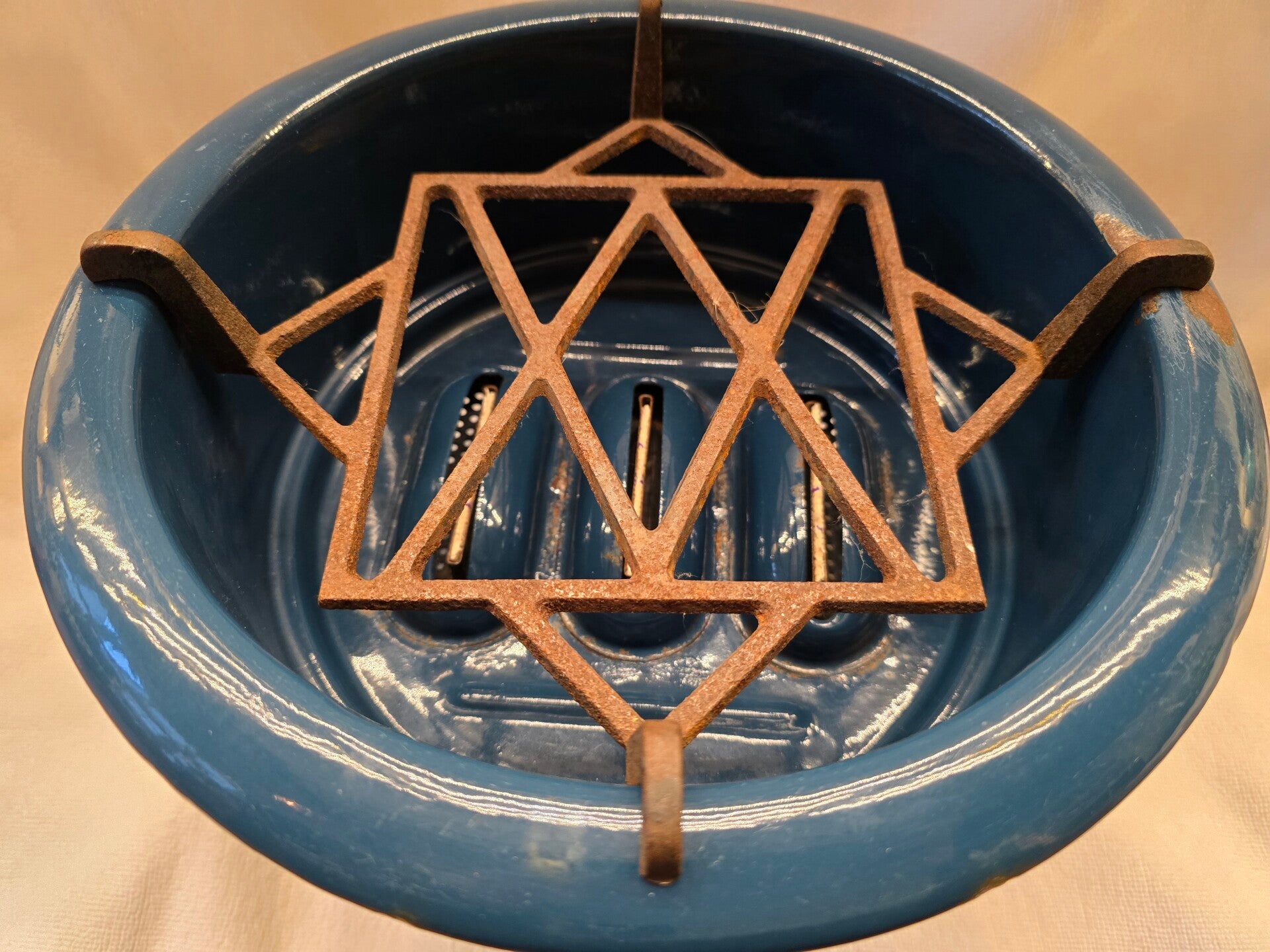 Dit petroleumstel heeft wat roest op het rekje. Dit heeft geen invloed op de stabiliteit van het rekje. Dit petroleumstel heeft op de rand van het bovenste deel twee beschadigingen. Aan de binnekannt van het bovenste deel zitten een aantal beschadigdingen. Onder de rand en aan de onderkant van het bovenste deel, zitten wat roest plekjes en kleine beschadigingen. Bovenop de pitten een een aantal roest plekjes. Rondom de rand van de pitten zitten roest plekjes. Onder de pitten zitten wat roest plekjes. Dit heeft geen invloed op het functioneren van de pitten.