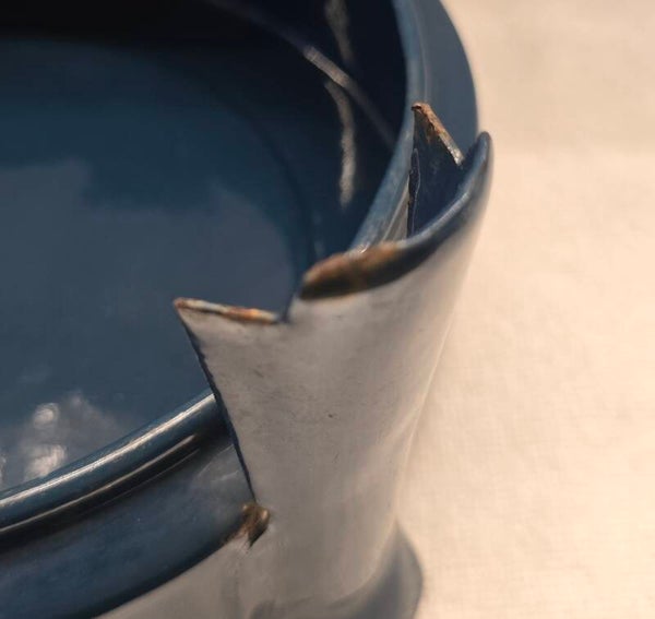 Bij de zijkanten van één van de pootjes zit een kleine beschadiging. Dit heeft geen invloed op de zijkant of de stabiliteit. Op de onderkant van het onderste deel zitten paar kleine beschadigingen. Dit heeft geen invloed op de de bodem. Dit kan niet gaan lekken. Op de pootjes zitten op de bovenkant, aan de zijkanten en aan de onderkant wat roest plekejs en kleine beschadigingen. Dit heeft geen invloed op de stabiliteit van het petroleumstel.