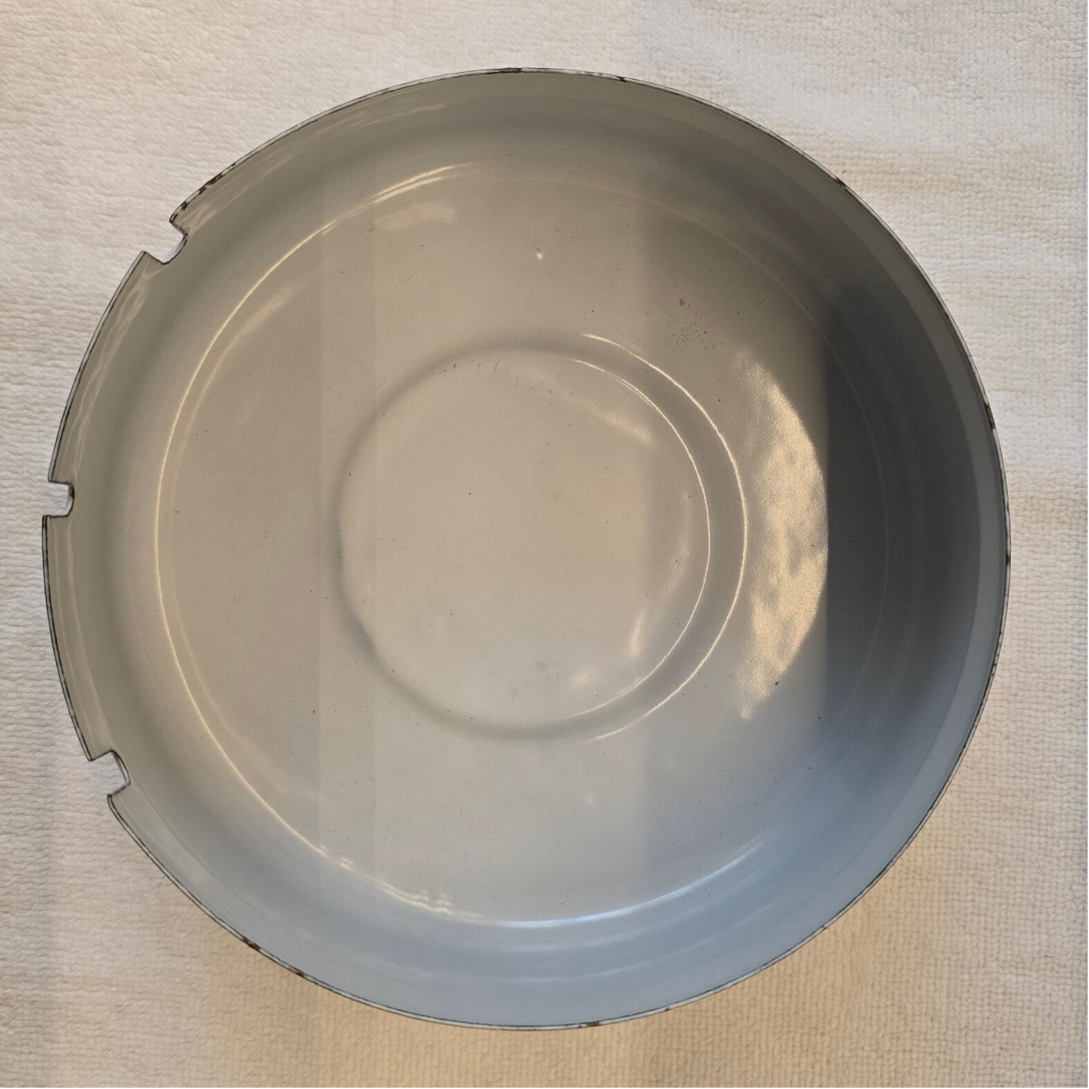 Rondom de rand van het onderste deel zitten wat kleine roest plekjes. Aan de binnenkant zitten wat lichte roest plekjes. Dit heeft geen invloed op de bodem. Aan de onderkant van het petroleumstel zit een oneffenheid in het emaille. Dit heeft geen invloed op de bodem. Emaille is handwerk en kan daardoor wat oneffenheden bevatten. Hier hebben wij helaas geen invloed op.