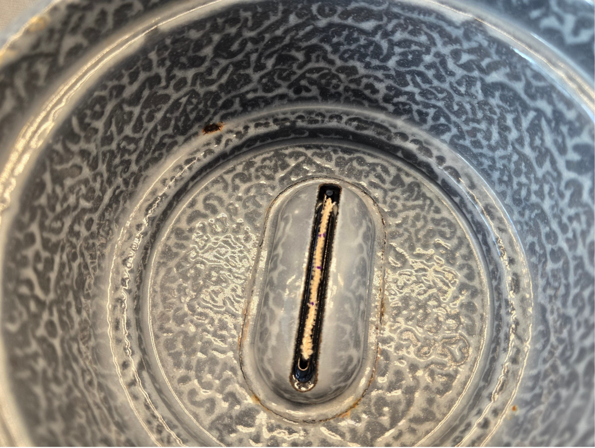 Dit petroleumstel heeft aan de binnenkant van het bovenste deel een paar kleine plekjes. Aan de bovenkant en aan de onderkant van de rand zitten hier en daar een aantal beschadigingen. Op de onderkant van het bovenste deel zit een kleine beschadiging. Aan de rand van het onderste deel zitten een paar kleine roest plekjes. Op de pootjes zitten op de bovenkant en aan de onderkant wat kleine roest plekjes. Dit heeft geen invloed op de stabiliteit van het petroleumstel. Op het onderbord zit op de rand een kleine beschadiging.