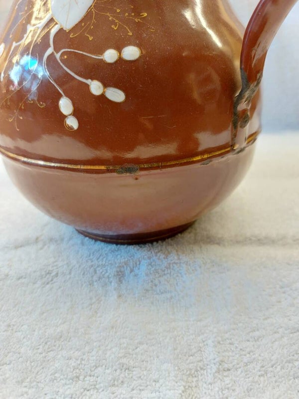 Deze oude emaille koffiepot heeft een luxe uitstraling. Dit komt door het opgelegde emaille. Deze bloemen en andere versieringen werden bij deze variant er niet op geschilderd. Dit geeft een leuke 3D effect.