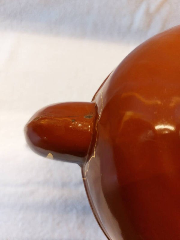 Deze emaille koffiepot heeft een aantal beschadigingen aan het deksel. Het heeft een aantal kleine beschadigingen aan de tuit, een paar beschadigingen aan het handvat en aan de buitenkant van de pot.