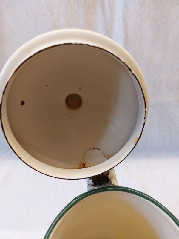 Deze oude koffiepot heeft een paar kleine beschadigingen aan het deksel en aan de onderkant.