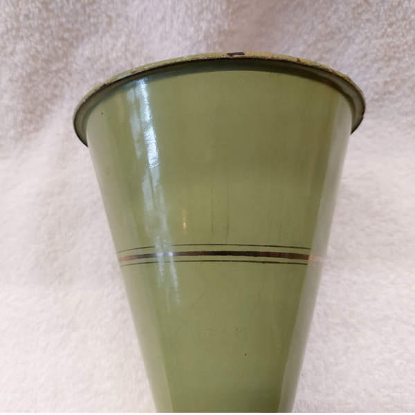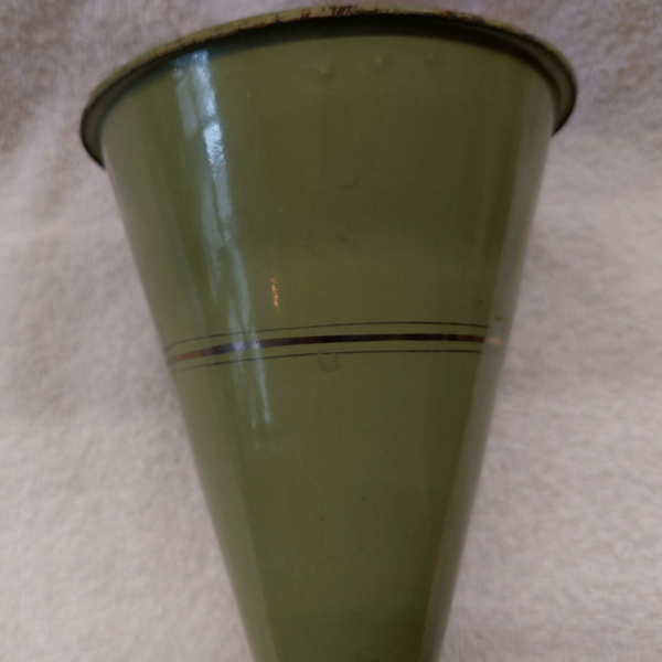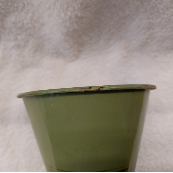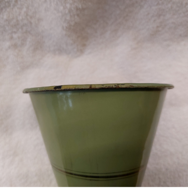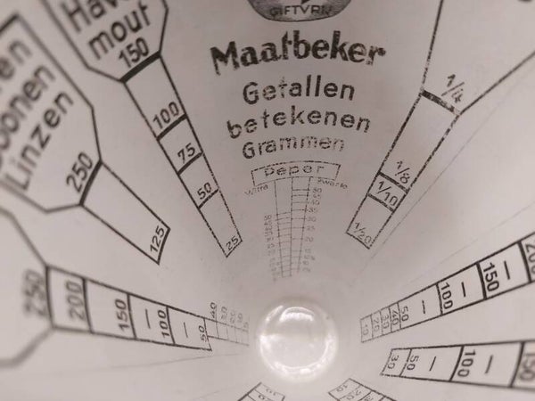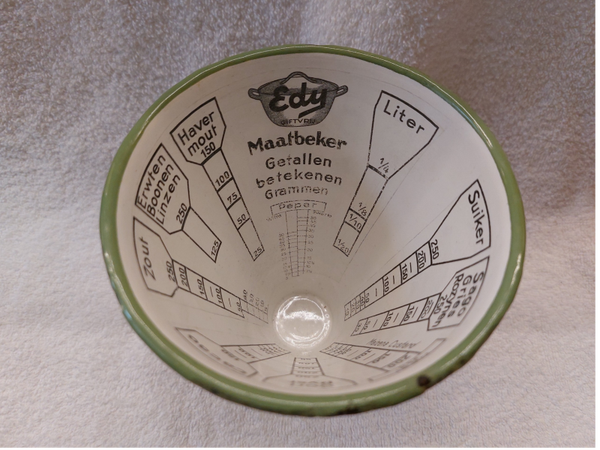 Deze oude emaille maatbeker werd vroeger veel gebruikt om allerlei soorten etenswaren af te meten. Zo verspilde men nooit te veel etenswaren.