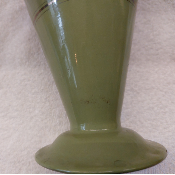 Op de rand van de bovenkant zitten een aantal beschadigingen. Aan de binnenkant is een del van de tekst wat verweerd in de loop der jaren. Op de zijkanten zitten een aantal krassen en een lichte beschadiging. Op het voetjes zit aan de bovenkant een aantal kleine beschadigingen.