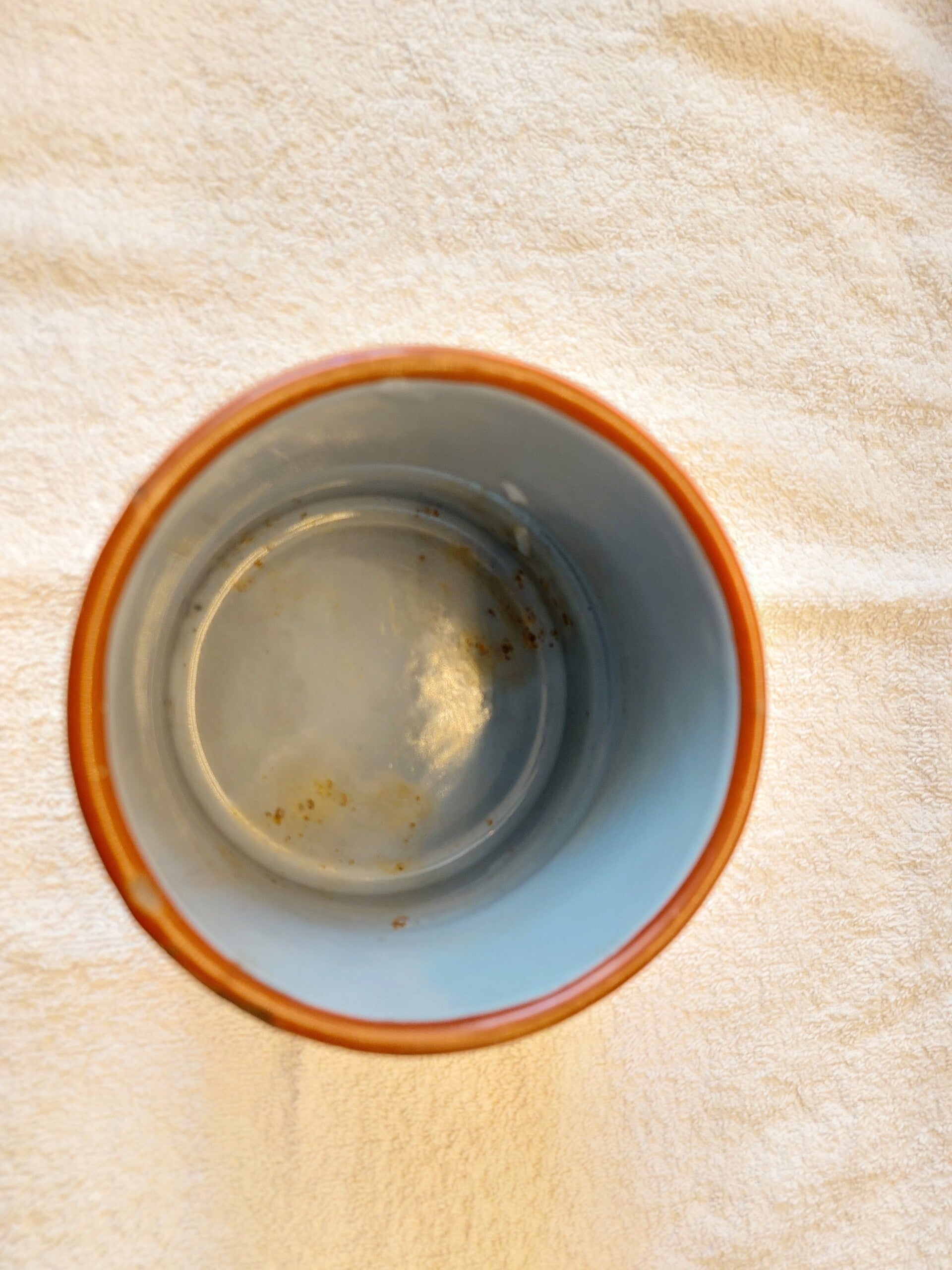 Het 'zand' bakje heeft een beschadiging op de voorkant. Op de onderkant zitten een aantal beschadigingen en aan de binnenkant zitten een aantal lichte beschadigingen. Er zitten ook een paar kleine bobbeltjes in het emaille. Emaille werd, en wordt nog steeds met de hand gemaakt. Door alle oneffenheden maakt het ieder Item uniek! Helaas zijn deze oneffenheden niet te voorkomen.