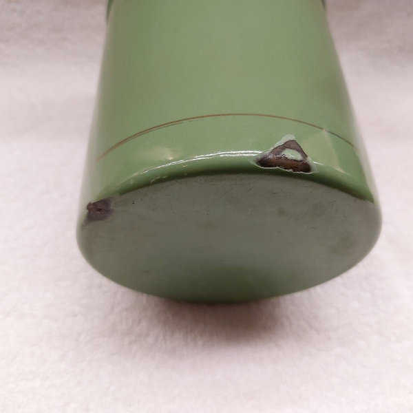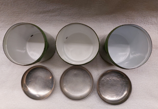 De koffie bus heeft een aantal beschadigingen aan de buitenkant, op de rand en een beschadiging aan de binnenkant. De thee bus heeft een aantal kleine beschadigingen op de onderkant en een aantal kleine beschadigingen aan de binnenkant. De suiker bus heeft op de onderkant een aantal kleine beschadigingen. Op de rand van de suiker bus zitten een aantal kleine beschadigingen. De deksels hebben een aantal deukjes.